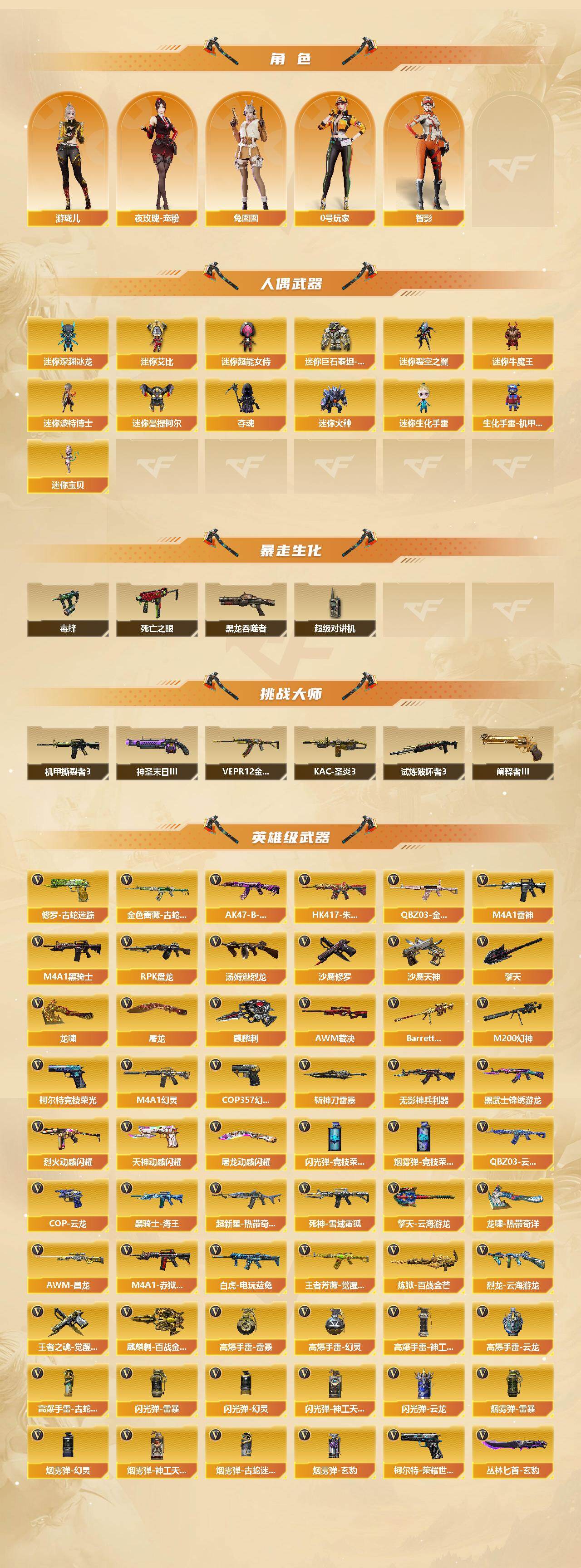 【热门武器】:QBZ03-金色蔷薇,HK417-朱雀,M200-幻神,柯尔特-荣耀世冠白鲨2023,金色蔷薇-古蛇迷踪,修罗-古蛇迷踪,死亡之眼,白虎-电玩蓝兔,毒蜂,M4A1-黑骑士*2,汤姆逊-烈龙*2,RPK-盘龙,COP 357-幻灵,沙鹰-修罗*2