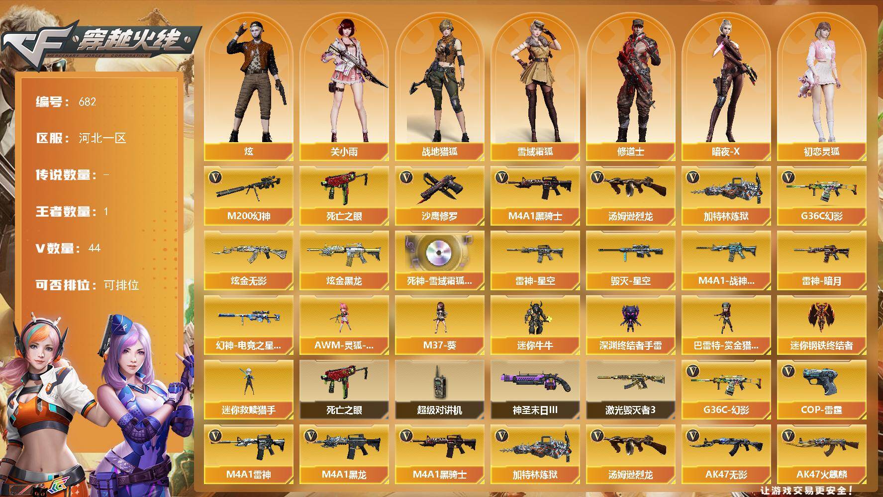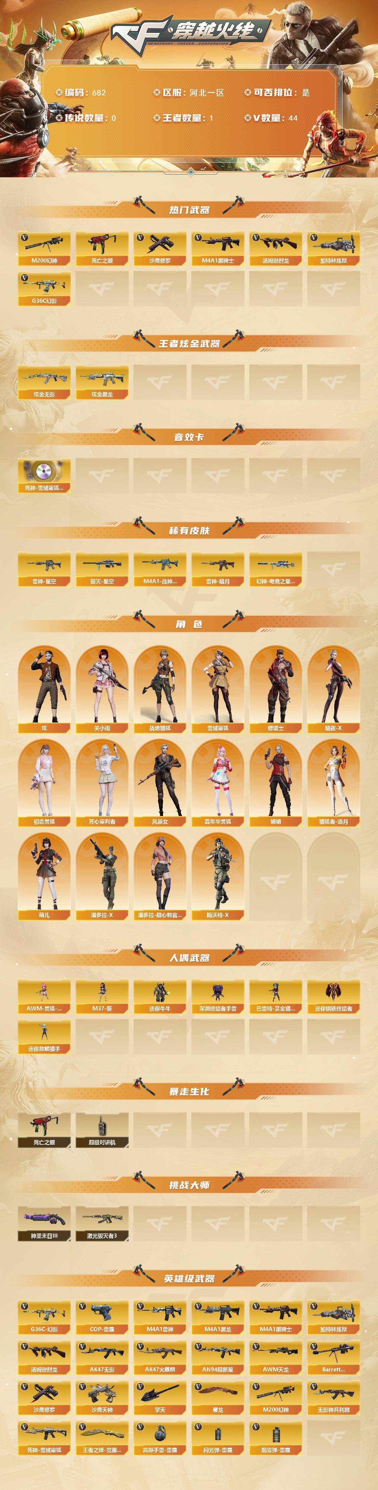 [15356509]河北一区-44V-1王者-2炫金 【热门武器】:G36C-幻影,M200-幻神,死亡之眼*2,M4A1-黑骑士,汤姆逊-烈龙*2,加特林-炼狱,沙鹰-修罗 【王者炫金武器】:炫金无影,炫金黑龙 【音效卡】:死神-雪域霜狐-怀旧音效卡 【皮肤】:幻神-电竞之星 皮肤,雷神-暗月,雷神-星空,M4A1-战神赵云,毁灭-星空 【角色】:炫,关小雨,战地猎狐,雪域霜狐,修道士,暗夜-X,初恋灵狐,芳心审判者,风暴女,嘉年华灵狐,娟娟,猎狐者-追月,萌儿,潘多拉-X,潘多拉-甜心教官,斯沃特-X 【人偶武器】:迷你钢铁终结者,迷你救赎猎手,AWM-灵狐-15周年嘉年华,M37-葵,迷你牛牛,深渊终结者手雷,巴雷特-赏金猎人 【暴走生化】:死亡之眼*2,超级对讲机 【挑战大师】:激光毁灭者III,神圣爆裂者-末日III 【英雄级武器】:AK47-火麒麟,M4A1-黑龙*2,M4A1-雷神,M4A1-黑骑士,AK47-无影,AN94-超新星,无影-神兵利器,G36C-幻影,死神-雪域霜狐,AWM-天龙,Barrett-毁灭,M200-幻神,加特林-炼狱,汤姆逊-烈龙*2,沙鹰-修罗,沙鹰-天神,COP-雷霆,屠龙*2,擎天*2,王者之锋-觉醒版,高爆手雷-雷霆*4,闪光弹-雷霆*4,烟雾弹-雷霆*4 【道具】:BS战队炫彩背包,CFS限定背包,云山科技背包,亚洲杯纪念炫彩背包,炫彩背包-诺拉,炫彩背包,雪域霜狐炫彩背包,地狱终结者-妲己,女皇终结者-魔龙之吻,救世主-黑桃战神,黄金生化钩,绿色巨人,灵魂忍者,变异宝贝,迷雾幽灵,夺命之镰,防化服*3,金色流光-枪王排位*2,星辰流光-枪王排位,流光-再燃火线,枪王排位29赛季金色流光,语音特效-怀旧,雪域霜狐表情,C4-再燃火线,防弹头盔*4,防弹衣*4,C4工具钳*4,手雷包*5 【特殊枪械】:1黑骑士,2烈龙,1炼狱