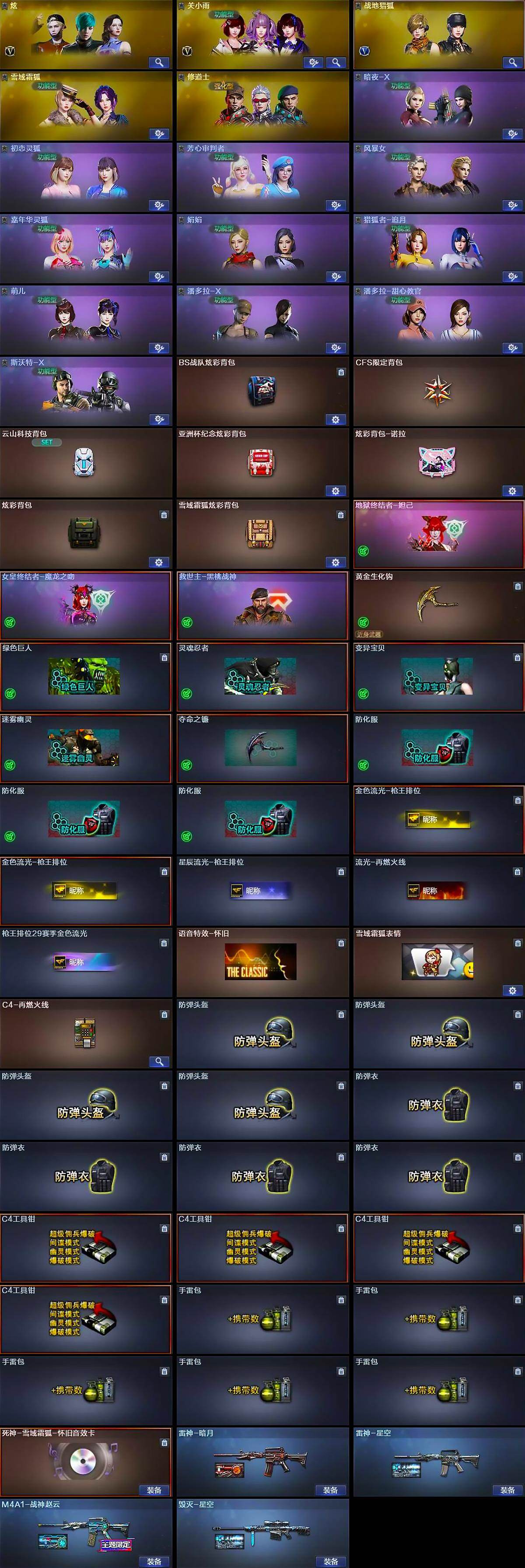 【道具】:BS战队炫彩背包,CFS限定背包,云山科技背包,亚洲杯纪念炫彩背包,炫彩背包-诺拉,炫彩背包,雪域霜狐炫彩背包,地狱终结者-妲己,女皇终结者-魔龙之吻,救世主-黑桃战神,黄金生化钩,绿色巨人,灵魂忍者,变异宝贝,迷雾幽灵,夺命之镰,防化服*3,金色流光-枪王排位*2,星辰流光-枪王排位,流光-再燃火线,枪王排位29赛季金色流光,语音特效-怀旧,雪域霜狐表情,C4-再燃火线,防弹头盔*4,防弹衣*4,C4工具钳*4,手雷包*5