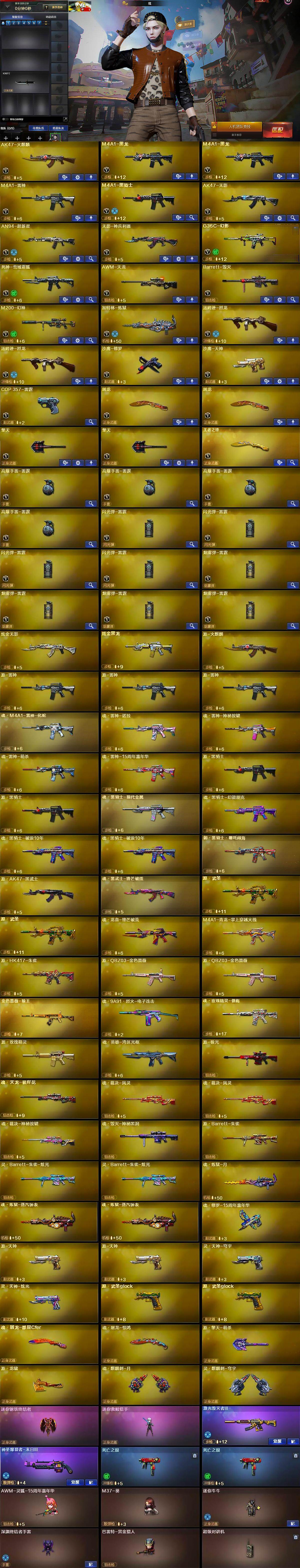 【英雄级武器】:AK47-火麒麟,M4A1-黑龙*2,M4A1-雷神,M4A1-黑骑士,AK47-无影,AN94-超新星,无影-神兵利器,G36C-幻影,死神-雪域霜狐,AWM-天龙,Barrett-毁灭,M200-幻神,加特林-炼狱,汤姆逊-烈龙*2,沙鹰-修罗,沙鹰-天神,COP-雷霆,屠龙*2,擎天*2,王者之锋-觉醒版,高爆手雷-雷霆*4,闪光弹-雷霆*4,烟雾弹-雷霆*4