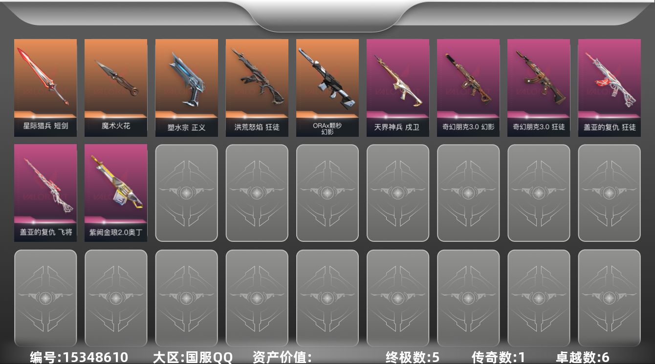 [15348610]【英雄】:炼狱,暮蝶,壹决,捷风,不死鸟,贤者,猎枭,芮娜,尚勃勒,K/O 【近战武器】:近战武器-魔术火花,近战武器-星际猎兵 短剑,近战武器-魔术火花,近战武器-魔术火花,近战武器-星际猎兵 短剑,近战武器-魔术火花 【狂徒】:狂徒-洪荒怒焰,狂徒-盖亚的复仇,狂徒-奇幻朋克//3.0,狂徒-洪荒怒焰,狂徒-盖亚的复仇,狂徒-奇幻朋克//3.0 【幻影】:幻影-ORA x 颗秒,幻影-奇幻朋克//3.0,幻影-ORA x 颗秒,幻影-奇幻朋克//3.0 【戍卫】:戍卫-天界神兵,戍卫-天界神兵 【飞将】:飞将-盖亚的复仇,飞将-盖亚的复仇 【奥丁】:奥丁-紫阙金琅//2.0,奥丁-紫阙金琅//2.0 【骇灵】:骇灵-无限竞技,骇灵-无限竞技 【正义】:正义-塑水宗,正义-塑水宗 【卡面】:从黄昏到黎明 卡面,欢迎来到底城 卡面,无畏契约:暮蝶 卡面,正义的化身 卡面,树懒大作战 卡面,红鳞松叶 卡面,Clutch 卡面,梦幻奶茶 卡面,脚踝终结者 卡面 ,无畏契约GO!第一卷:芮娜 卡面,无畏契约GO!第一卷:零 卡面,《双城之战》金克丝 卡面,无畏契约GO!第一卷:贤者 卡面,钢锁vs盖可 卡面,代号红色 卡面,新兵报到 卡面,V契约 卡面,无畏契约 卡面 【喷漆】:伤心心 喷漆,蛋糕还是爆能器? 喷漆,捷风差距 喷漆,双人比心 喷漆,买装还是存钱 喷漆,红鳞 喷漆,无畏契约GO!第一卷:贤者 喷漆,暴走萝莉 喷漆,无畏契约GO!第一卷:奇乐 喷漆,胜利属于无畏契约 喷漆,GLHF 喷漆,无畏契约 喷漆 【挂饰】:薰衣草之心 挂饰,袖珍捷风 挂饰,天外飞客 挂饰,《双城之战》魄罗 挂饰,无畏契约 纪念币 挂饰