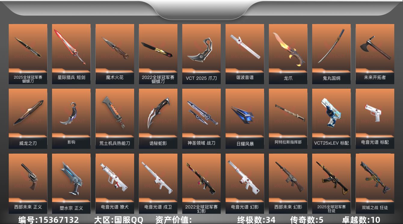 [15367132]可二次【店主推荐捡漏号!可直接换绑】【套装】:2025全球冠军赛套装,2022全球冠军赛套装,上古龙炎套装,电音光谱套装,VCT 2025 赛季套装,西部未来套装,般若假面//2.0套装 【英雄】:幻棱,炼狱,维斯,暮蝶,钛狐,壹决,铁臂,捷风,雷兹,幽影,不死鸟,贤者,猎枭,蝰蛇,零,芮娜,奇乐,尚勃勒,霓虹,斯凯,夜露,星礈,K/O,海神,盖可,黑梦,钢锁 【近战 武器】:近战武器-2025全球冠军赛 蝴蝶刀,近战武器-2022全球冠军赛 蝴蝶刀,近战武器-魔术火花,近战武器-影钩,近战武器-谐波音谱,近战武器-VCT 2025 爪刀,近战武器-威龙之刃,近战武器-鬼丸国纲,近战武器-未来开拓者,近战武器-龙爪,近战武器-荒土机兵 热能刀,近战武器-诡秘蛇影 军刀,近战武器-神圣领域 战刀,近战武器-日耀风暴 遗器,近战武器-阿特拉斯指挥部 甩棍,近战武器-星际猎兵 短剑,近战武器-魔术火花 【狂徒】:狂徒-上古龙炎,狂徒-2025全球冠军赛,狂徒-洪荒怒焰,狂徒-混沌序曲,狂徒-双城之战,狂徒-塑水宗,狂徒-光荣异象,狂徒-般若假面//2.0,狂徒-掠影,狂徒-盖亚的复仇,狂徒-紫阙金琅,狂徒-荒土机兵,狂徒-诡秘蛇影 【幻影】:幻影-2022全球冠军赛,幻影-西部未来,幻影-电音光谱,幻影-侦察力量,幻影-神圣领域,幻影-纳米打击,幻影-末日之翼,幻影-西部未来,幻影-电音光谱 【戍卫】:戍卫-电音光谱,戍卫-逆冲蛮牛,戍卫-月球哨兵,戍卫-折光棱晶,戍卫-电音光谱 【獠犬】:獠犬-电音光谱,獠犬-般若假面//2.0,獠犬-日冕雄师,獠犬-神圣领域,獠犬-逆冲蛮牛,獠犬-电音光谱 【冥驹】:冥驹-上古龙炎,冥驹-荒土机兵,冥驹-星云暗涌 【飞将】:飞将-西部未来,飞将-末日之翼 【莽侠】:莽侠-诡秘蛇影,莽侠-月球哨兵 【战神】:战神-般若假面//2.0,战神-离子武器//2.0,战神-神圣领域 【奥丁】:奥丁-西部未来,奥丁-纳米打击,奥丁-末日之翼 【判官】:判官-上古龙炎,判官-诡秘蛇影,判官-纳米打击x 【雄鹿】:雄鹿-逆冲蛮牛,雄鹿-月球哨兵 【骇灵】:骇灵-荒土机兵,骇灵-无限竞技,骇灵-星云暗涌 【蜂刺】:蜂刺-星云暗涌,蜂刺-折光棱晶 【标配】:标配-电音光谱,标配-荒土机兵,标配-折光棱晶,标配-电音光谱 【VCT手枪】:标配-VCT25