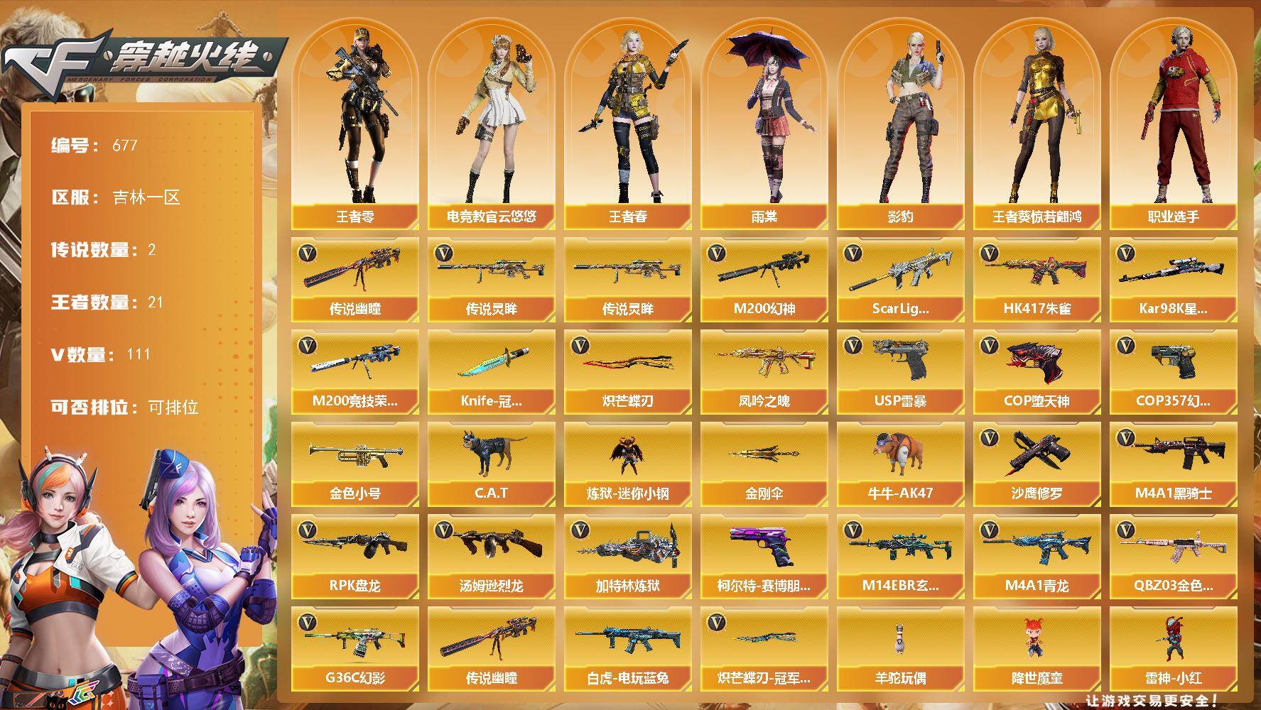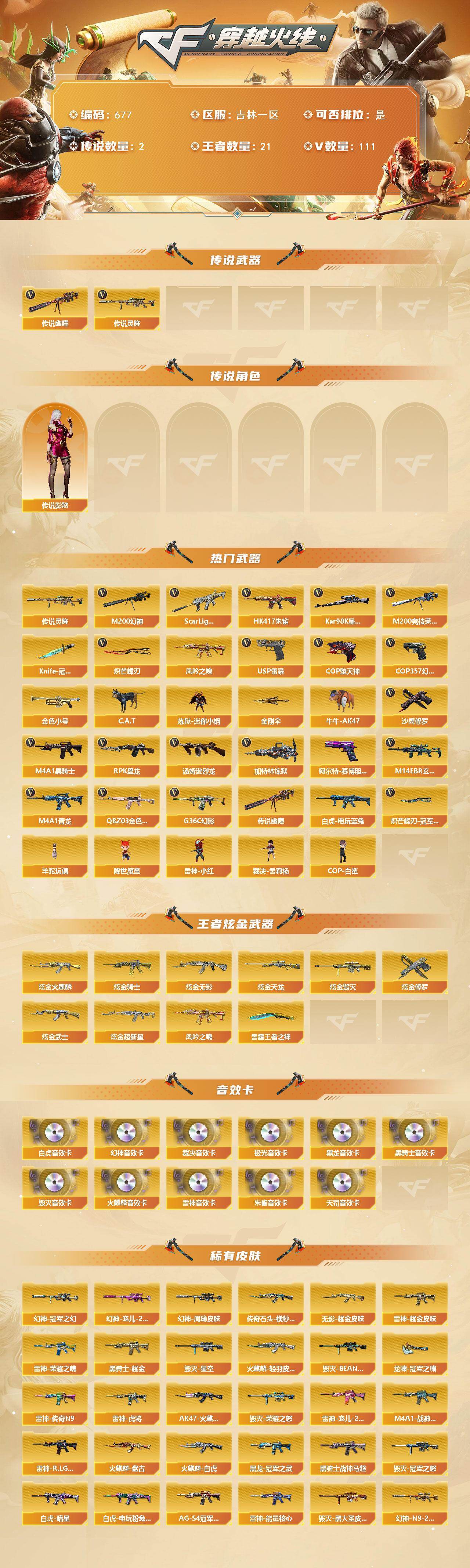 [15367657]吉林一区-111V-21王者-9炫金 【传说武器】:传说灵眸,传说幽瞳 【传说角色】:传说影煞 【热门武器】:传说幽瞳,传说灵眸,G36C-幻影,QBZ03-金色蔷薇,M14EBR-玄武,Scar Light-白虎,HK417-朱雀,M4A1-青龙,M200-幻神,M200-竞技荣光,凤吟之魄,白虎-电玩蓝兔,Kar98K-星神,金色小号,C.A.T,炼狱-迷你小钢,牛牛-AK47,M4A1-黑骑士,汤姆逊-烈龙*4,RPK-盘龙,加特林-炼狱*3,羊驼玩偶,降世魔童,雷神-小红,裁决-雪莉杨,COP-白鲨,USP-雷暴,COP-堕天神*2,COP 357-幻灵,沙鹰-修罗*3,柯尔特-赛博朋克,Knife-冠军之刃*2,炽芒蝶刃,炽芒蝶刃-冠军炽芒皮肤,金刚伞 【王者炫金武器】:凤吟之魄,雷霆王者之锋,炫金火麒麟,炫金骑士,炫金无影,炫金武士,炫金超新星*2,炫金毁灭,炫金天龙,炫金修罗 【音效卡】:M200-幻神音效卡,AK47-火麒麟音效卡,M4A1-雷神音效卡,M4A1-黑龙音效卡*2,M4A1-黑骑士音效卡,Barrett-毁灭音效卡,Barrett-极光音效卡,AWM-裁决音效卡,Scar Light-白虎音效卡,HK417-朱雀音效卡,QBZ03-天罚音效卡 【皮肤】:幻神-周瑜皮肤,幻神-冠军之幻,幻神-宠儿-2021MVP,M200-幻神-N9-2022MVP,幻神-电流骇客 皮肤,幻神-星火小队签名臻藏版 皮肤,幻神-荣耀世冠白鲨2023 皮肤,Scar Light-白虎-暗星,白虎-电玩粉兔皮肤,QBZ03-巅峰荣耀皮肤,金色蔷薇-量子蔷薇 皮肤,裁决-流光秘银,AWM-裁决-凤灵皮肤,星神-璀璨皮肤,雷神-暗月,雷神-能量核心,雷神-荣耀之魄,雷神-虎将,雷神-耀金皮肤,雷神-传奇N9,M4A1-战神赵云,雷神-宠儿-2019MVP,雷神-R.LGD-CFPLS18冠军,雷神-航星皮肤,M4A1-雷神-巅峰荣耀皮肤,雷神-云海游龙皮肤,火麒麟-雷神,AK47-火麒麟-传奇EVEN*2,火麒麟-轻羽皮肤,传奇石头-横秒之巅,火麒麟-平天大圣,火麒麟-盘古,火麒麟-白虎,火麒麟-心动糖果,毁灭-荣耀之怒,毁灭-星空,毁灭-冠军之怒,毁灭-BEAN-2020MVP,毁灭-黑大圣皮肤,黑龙-能量核心,黑龙-冠军之武,黑骑士耀金皮肤,黑骑士-战神马超