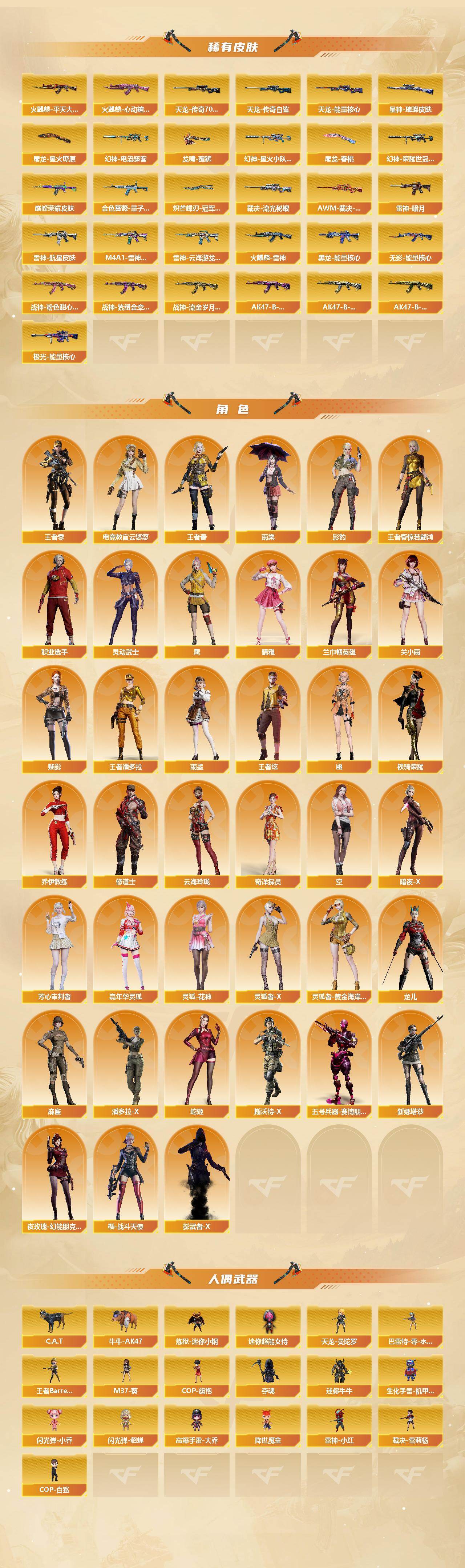 【皮肤】:幻神-周瑜皮肤,幻神-冠军之幻,幻神-宠儿-2021MVP,M200-幻神-N9-2022MVP,幻神-电流骇客 皮肤,幻神-星火小队签名臻藏版 皮肤,幻神-荣耀世冠白鲨2023 皮肤,Scar Light-白虎-暗星,白虎-电玩粉兔皮肤,QBZ03-巅峰荣耀皮肤,金色蔷薇-量子蔷薇 皮肤,裁决-流光秘银,AWM-裁决-凤灵皮肤,星神-璀璨皮肤,雷神-暗月,雷神-能量核心,雷神-荣耀之魄,雷神-虎将,雷神-耀金皮肤,雷神-传奇N9,M4A1-战神赵云,雷神-宠儿-2019MVP,雷神-R.LGD-CFPLS18冠军,雷神-航星皮肤,M4A1-雷神-巅峰荣耀皮肤,雷神-云海游龙皮肤,火麒麟-雷神,AK47-火麒麟-传奇EVEN*2,火麒麟-轻羽皮肤,传奇石头-横秒之巅,火麒麟-平天大圣,火麒麟-盘古,火麒麟-白虎,火麒麟-心动糖果,毁灭-荣耀之怒,毁灭-星空,毁灭-冠军之怒,毁灭-BEAN-2020MVP,毁灭-黑大圣皮肤,黑龙-能量核心,黑龙-冠军之武,黑骑士耀金皮肤,黑骑士-战神马超