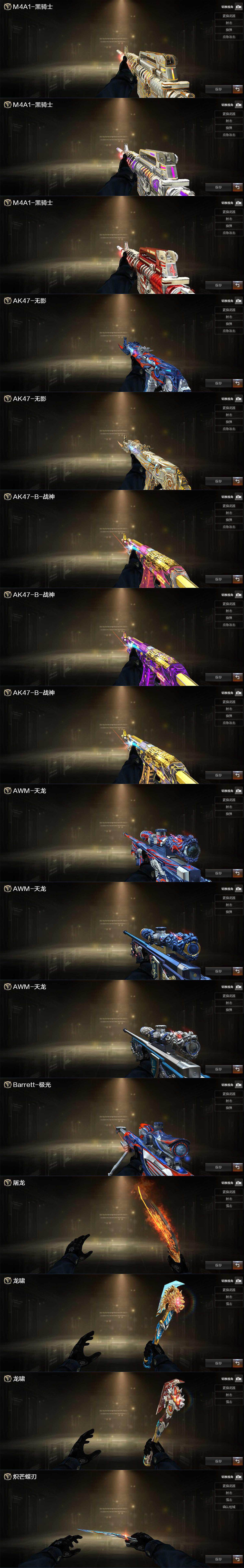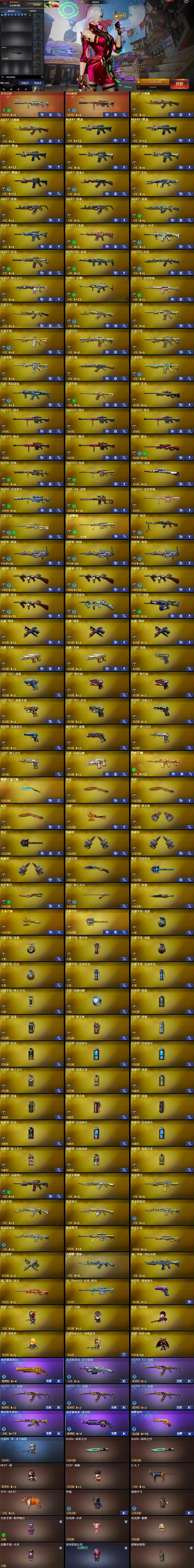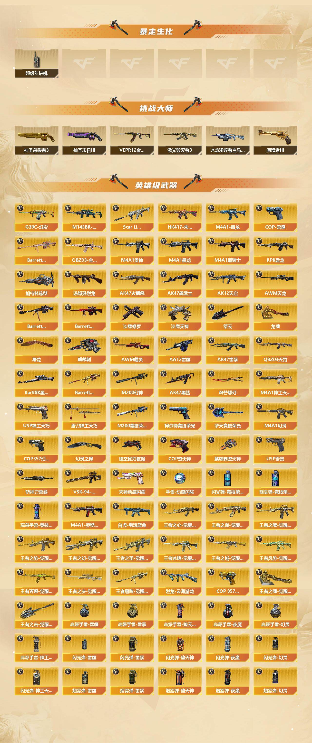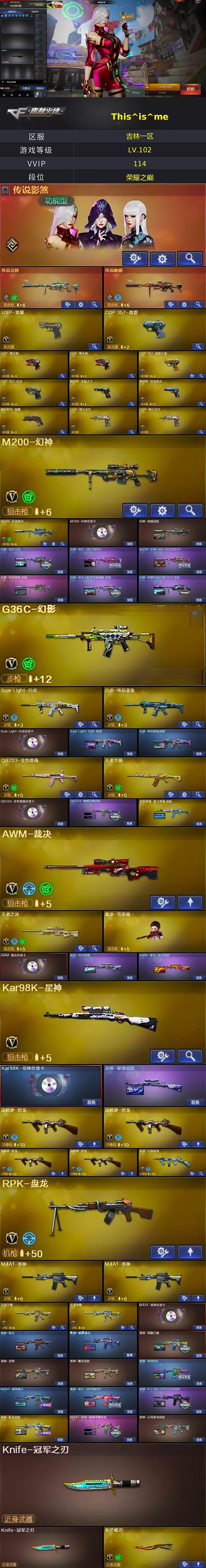 【热门武器】:传说幽瞳,传说灵眸,G36C-幻影,QBZ03-金色蔷薇,M14EBR-玄武,Scar Light-白虎,HK417-朱雀,M4A1-青龙,M200-幻神,M200-竞技荣光,凤吟之魄,白虎-电玩蓝兔,Kar98K-星神,金色小号,C.A.T,炼狱-迷你小钢,牛牛-AK47,M4A1-黑骑士,汤姆逊-烈龙*4,RPK-盘龙,加特林-炼狱*3,羊驼玩偶,降世魔童,雷神-小红,裁决-雪莉杨,COP-白鲨,USP-雷暴,COP-堕天神*2,COP 357-幻灵,沙鹰-修罗*3,柯尔特-赛博朋克,Knife-冠军之刃*2,炽芒蝶刃,炽芒蝶刃-冠军炽芒皮肤,金刚伞