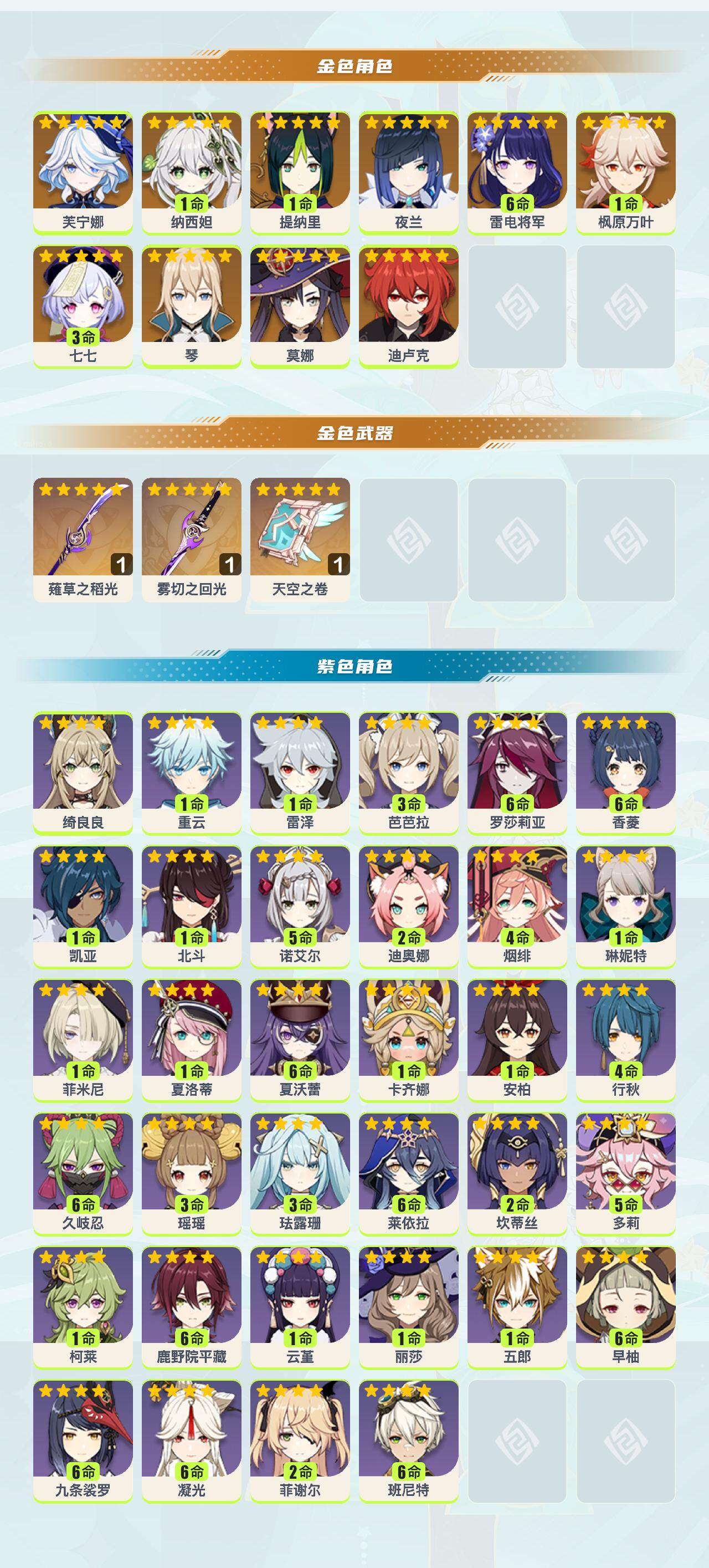 【紫色角色】:卡齐娜(0命),夏沃蕾(满命),夏洛蒂(1命),菲米尼(1命),琳妮特(1命),绮良良(0命),瑶瑶(3命),珐露珊(3命),莱依拉(满命),坎蒂丝(2命),多莉(5命),柯莱(1命),鹿野院平藏(满命),久岐忍(满命),云堇(1命),五郎(1命),九条裟罗(满命),早柚(满命),烟绯(4命),罗莎莉亚(满命),迪奥娜(2命),雷泽(1命),菲谢尔(2命),丽莎(1命),北斗(1命),香菱(满命),安柏(1命),班尼特(满命),行秋(4命),芭芭拉(3命),凝光(满命),诺艾尔(5命),凯亚(0命),重云(1命)