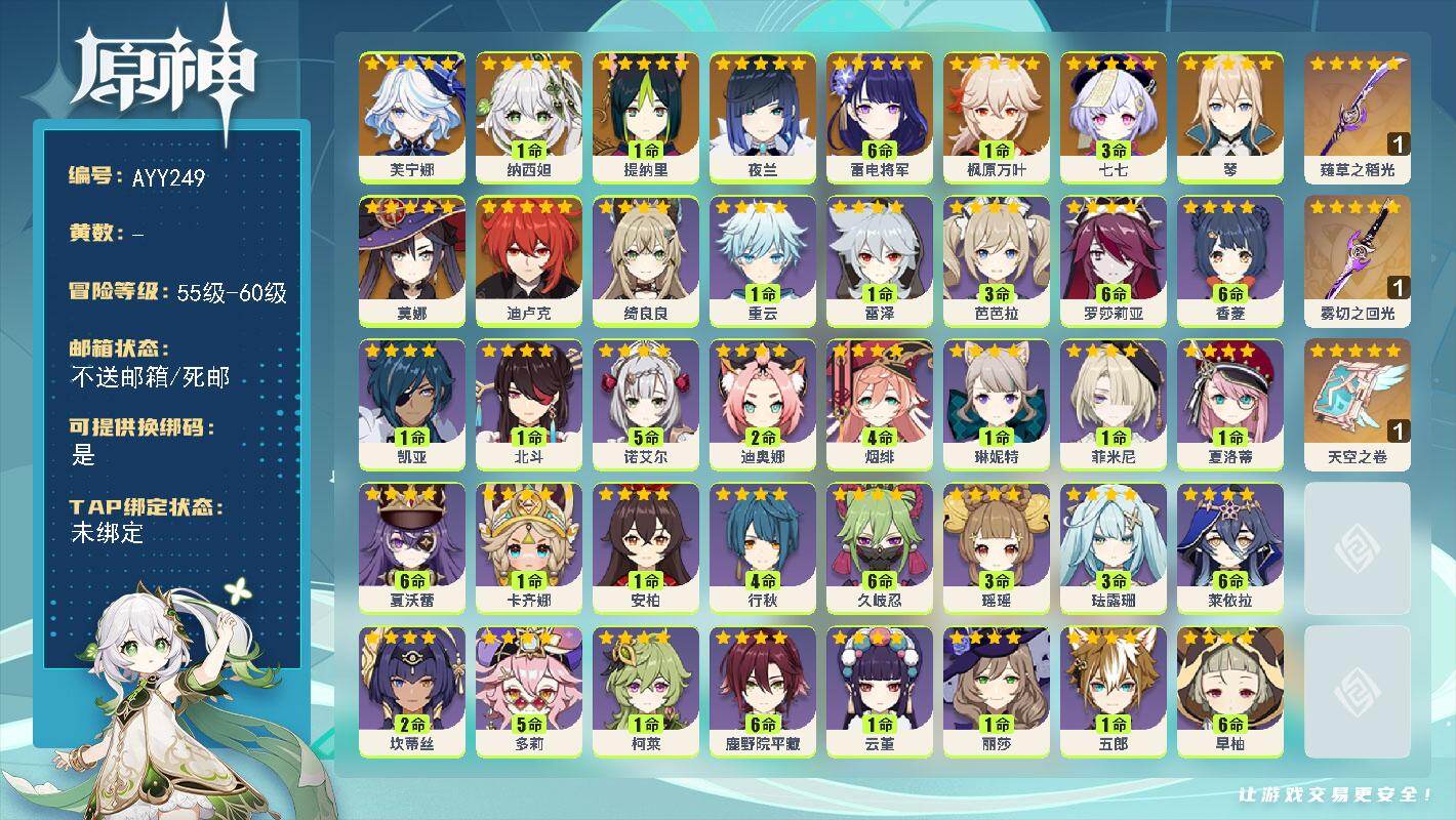 - [15553118]【店主推荐捡漏号】60级/95黄/女主/32个五星角色/16个五星武器 0命克洛琳德,0命阿蕾奇诺,2命芙宁娜,1命迪希雅,0命流浪者,2命纳西妲,0命妮露,2命提纳里,满命夜兰,0命八重神子,0命申鹤,0命优菈,2命雷电将军,1命枫原万叶,0命神里绫华,0命钟离,1命胡桃,0命甘雨,1命温迪,0命可莉,0命达达利亚,1命阿贝多,1命珊瑚宫心海,4命刻晴,1命七七,5命琴,满命莫娜,满命迪卢克,0命玛薇卡,0命茜特菈莉,0命梦见月瑞希,0命丝柯克,精1静水流涌之辉,精2碧落之珑,精1千夜浮梦,精1若水,精1神乐之真意,精1薙草之稻光,精2护摩之杖,精1四风原典,精1和璞鸢,精2天空之翼,精1天空之刃,精3风鹰剑,精1狼的末路,精1苍耀