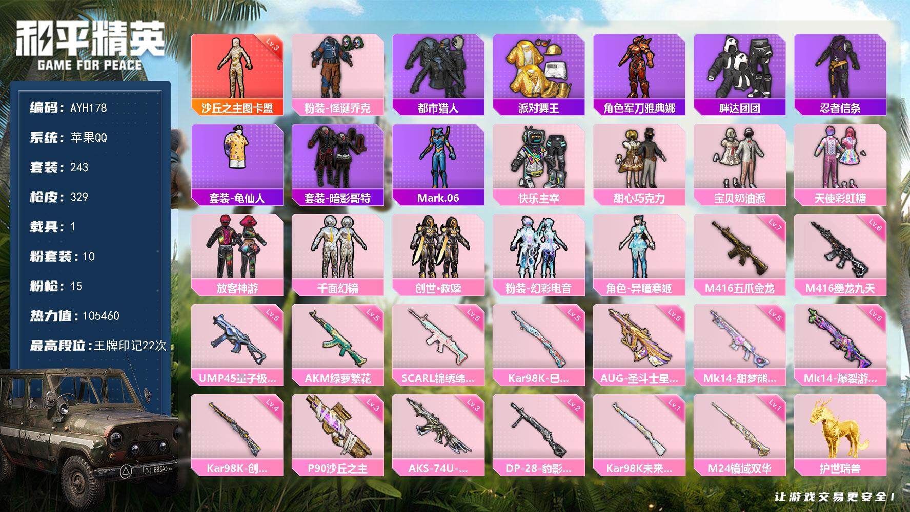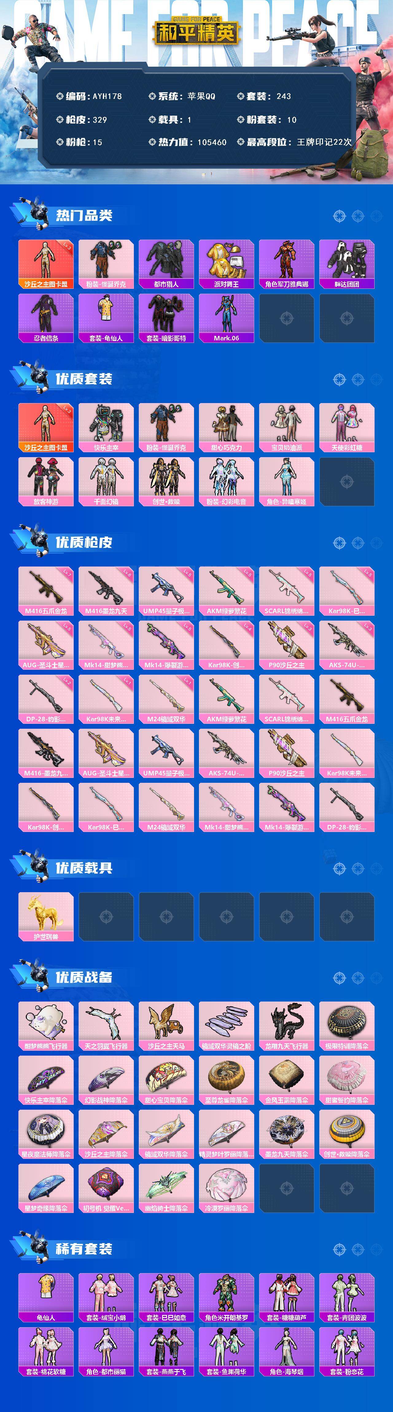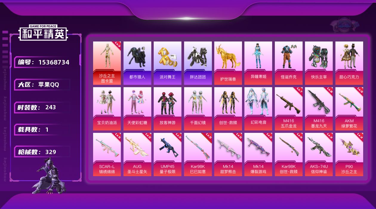 [15368734]苹果 手Q-1神装-10粉装-15特效枪-1载具-6粉色飞行器-105460热力值-22王牌印记-243套装-329枪皮【红色神装等级】:沙丘之主-图卡盟(三级)【红色角色神装】:沙丘之主-图卡盟【热门品类】:粉装-怪诞乔克,套装-都市猎人,套装-派对舞王,角色-军刀雅典娜,套装-胖达团团,套装-忍者信条,套装-龟仙人,套装-暗影哥特,角色-Mark.06【粉色套装】:粉装-快乐主宰,粉装-怪诞乔克,粉装-甜心巧克力,粉装-宝贝奶油派,粉装-天使彩虹糖,粉装-放客神游,粉装-千面幻镜,套装-创世·救赎,粉装-幻彩电音,角色-异瞳寒姬【粉色枪皮等级】:AKM-绿萝繁花(五级),SCAR-L-锦绣绵绵(五级),M416-五爪金龙(七级),M416-墨龙九天(六级),AUG-圣斗士星矢(五级),UMP45-量子极限(五级),AKS-74U-信仰神谕(三级),P90-沙丘之主(三级),Kar98K-未来歌姬(一级),Kar98K-创世·救赎(四级),Kar98K-巳巳如意(五级),M24-镜域双华(一级),Mk14-甜梦熊击(五级),Mk14-爆裂游戏(五级),DP-28-豹影疾电(二级)【粉色载具】:护世瑞兽【粉色枪皮】:AKM-绿萝繁花,SCAR-L-锦绣绵绵,M416-五爪金龙,M416-墨龙九天,AUG-圣斗士星矢,UMP45-量子极限,AKS-74U-信仰神谕,P90-沙丘之主,Kar98K-未来歌姬,Kar98K-创世·救赎,Kar98K-巳巳如意,M24-镜域双华,Mk14-甜梦熊击,Mk14-爆裂游戏,DP-28-豹影疾电【粉色飞行器】:酣梦熊熊飞行器,天之羽翼飞行器,沙丘之主天马,镜域双华-灵镜之阶,龙翔九天飞行器