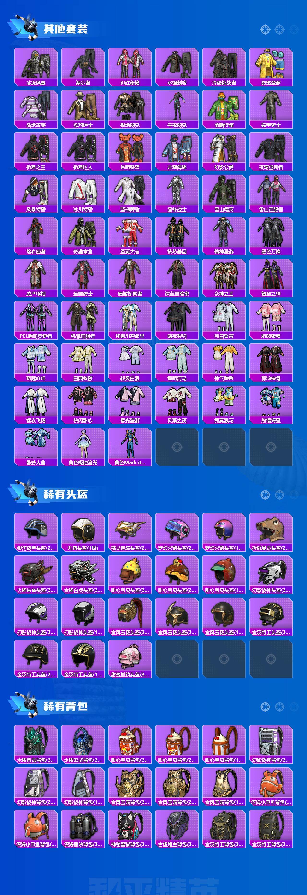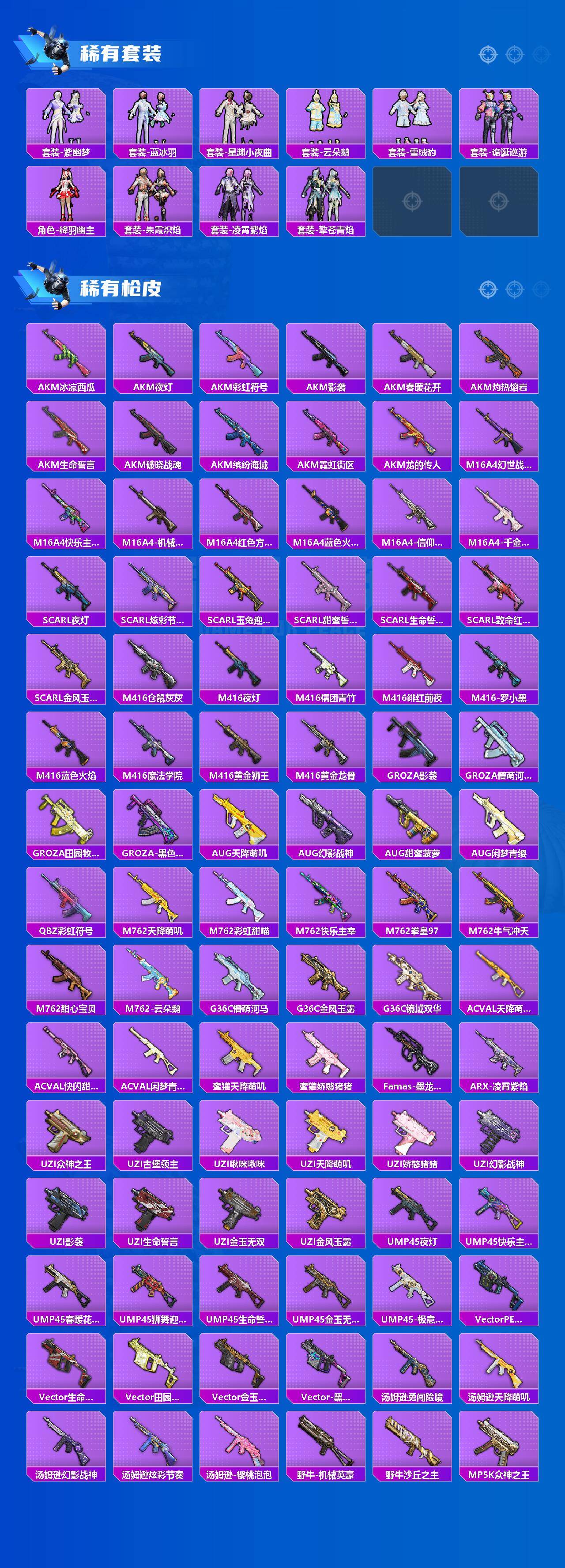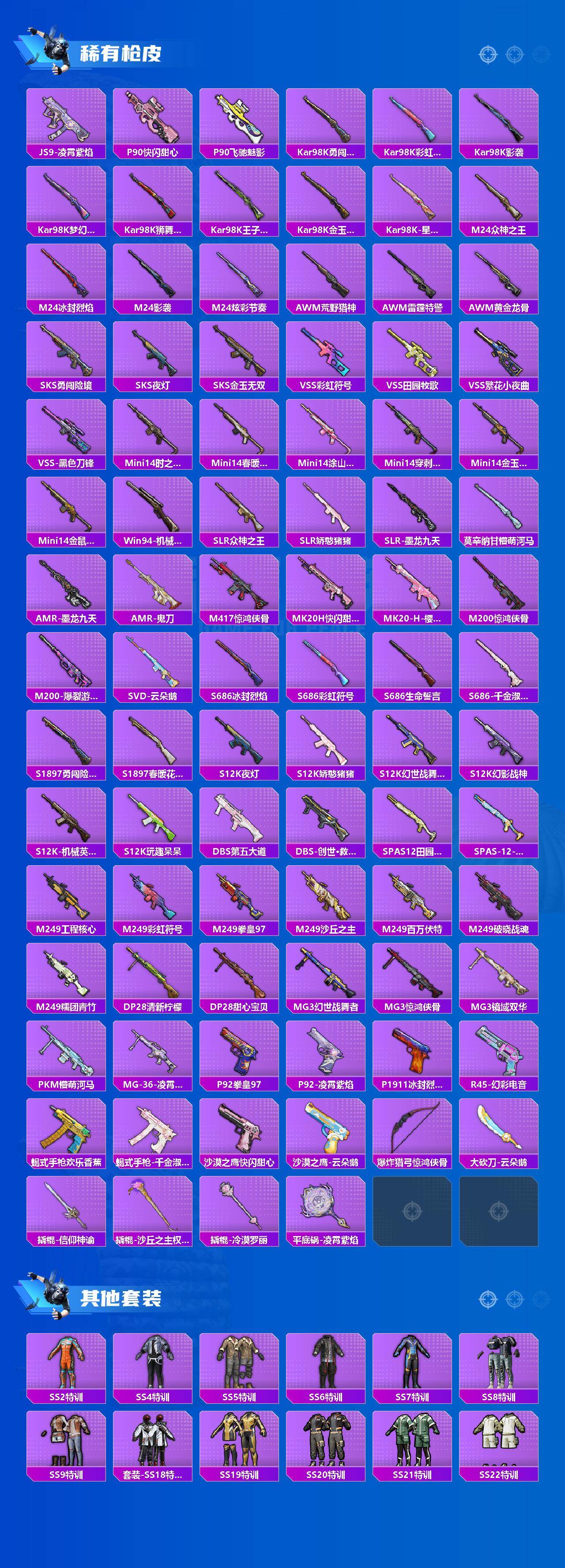 AKM-绿萝繁花,SCAR-L-锦绣绵绵,M416-五爪金龙,M416-墨龙九天,UMP45-量子极限,AKS-74U-信仰神谕,P90-沙丘之主,Kar98K-未来歌姬,Kar98K-创世·救赎,Kar98K-巳巳如意,M24-镜域双华