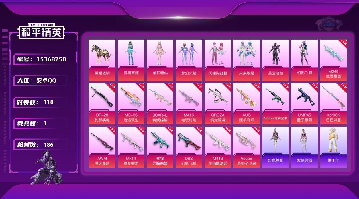 [15368750]安卓 手Q-7粉装-16特效枪-1载具-3粉色飞行器-58017热力值-15王牌印记-118套装-186枪皮【热门品类】:粉装-梦幻火箭,套装-龟仙人【粉色套装】:粉装-天使彩虹糖,粉装-梦幻火箭,粉装-未来歌姬,角色-星云暗核,粉装-幻影飞狐,角色-羊梦糖心,角色-异瞳寒姬【粉色枪皮等级】:SCAR-L-锦绣绵绵(五级),M416-电玩时刻(五级),M416-灵猫魔法师(三级),GROZA-镜光银凌(五级),AUG-暖羊咩咩(五级),M762-青锋波束(五级),蜜獾-异瞳寒姬(四级),UMP45-量子极限(五级),Vector-最终圣卫者(三级),Kar98K-巳巳如意(五级),AWM-湮灭星辰(五级),Mk14-甜梦熊击(五级),DBS-幻影飞狐(四级),M249-绒雪飘舞(六级),DP-28-豹影疾电(五级),MG-36-沧焰双生(五级)【粉色载具】:黑曜夜骑【粉色枪皮】:SCAR-L-锦绣绵绵,M416-电玩时刻,M416-灵猫魔法师,GROZA-镜光银凌,AUG-暖羊咩咩,M762-青锋波束,蜜獾-异瞳寒姬,UMP45-量子极限,Vector-最终圣卫者,Kar98K-巳巳如意,AWM-湮灭星辰,Mk14-甜梦熊击,DBS-幻影飞狐,M249-绒雪飘舞,DP-28-豹影疾电,MG-36-沧焰双生【粉色飞行器】:梦幻火箭飞行器,终晖之翼飞行器