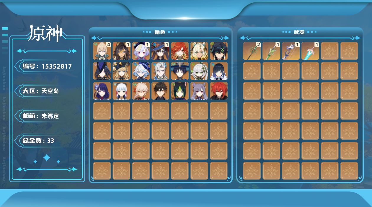 0命克洛琳德,0命娜维娅,0命芙宁娜,0命那维莱特,1命迪希雅,0命流浪者,0命纳西妲,0命提纳里,0命夜兰,0命雷电将军,0命枫原万叶,0命神里绫华,0命钟离,0命刻晴,1命七七,4命琴,1命莫娜,0命迪卢克,0命基尼奇,0命希诺宁,0命玛薇卡,精1裁叶萃光,精1若水,精2和璞鸢,精1天空之傲