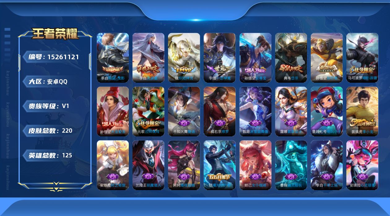[15261121]【店主推荐捡漏号!可直接换绑】安卓Q-V7-最强王者段位-125英雄-220皮肤-1典藏-4传说-65史诗 【荣耀典藏】:李白鸣剑曳影 【传说皮肤】:后羿神树通天,镜炽阳神光,李信一念神魔,李白凤求凰 【限定皮肤】:白起狰,姜子牙天穹之誓,狄仁杰阴阳师,虞姬凯尔特女王,赵云皇家上将,墨子神迹守卫,孙尚香蔷薇恋人,鲁班七号狮舞东方,庄周高山流水,高渐离死亡摇滚,阿轲迷踪丽影,钟无艳王者之锤,扁鹊炼金王,芈月重明,周瑜赤莲之焰,元歌云间偶戏,夏侯惇朔风刀,甄姬游园惊梦,曹操烛龙,典韦穷奇,典韦岱宗,马可波罗暗影游猎,狄仁杰魔术师,狄仁杰万华元夜,达摩星际陆战队,达摩沙漠行僧,项羽海滩派对,老夫子醍醐杖,老夫子航海奇遇记,程咬金演武夺筹,刘邦夺宝奇兵,兰陵王驯魔猎人,兰陵王金庭之子,亚瑟潮玩骑士王,孙悟空至尊宝,孙悟空大圣娶亲,孙悟空孙行者,牛魔御旌,李元芳银河之约,李元芳云中旅人,钟馗神迹守卫,钟馗驱傩正仪,雅典娜单词大作战,雅典娜黎明之约,蔡文姬繁星吟游,鬼谷子原初探秘者,苏烈千军破阵,百里玄策原初追逐者,弈星混沌棋,梦奇顽趣,沈梦溪星空之诺,沈梦溪大漠名商,明世隐疑决卦,裴擒虎李小龙,裴擒虎擒涛扼浪,狂铁御狮,米莱狄御霄,米莱狄胡桃异想国,云中君纤云弄巧,盾山御銮,猪八戒西部大镖客,上官婉儿梁祝,蒙犽狂想玩偶喵,鲁班大师探海日志,桑启海盐诗旅,艾琳女武神,张良古海寻踪,鬼谷子天穹祈灯 【年限皮肤】:李白凤求凰,典韦岱宗 【赛季限定】:扁鹊炼金王,白起狰,芈月重明,夏侯惇朔风刀,曹操烛龙,典韦穷奇,狄仁杰万华元夜,达摩沙漠行僧,老夫子醍醐杖,程咬金演武夺筹,兰陵王金庭之子,张良古海寻踪,牛魔御旌,李元芳云中旅人,虞姬凯尔特女王,钟馗驱傩正仪,雅典娜黎明之约,鬼谷子原初探秘者,苏烈千军破阵,百里玄策原初追逐者,弈星混沌棋,梦奇顽趣,沈梦溪大漠名商,明世隐疑决卦,裴擒虎擒涛扼浪,狂铁御狮,米莱狄御霄,盾山御銮,鲁班大师探海日志,桑启海盐诗旅,鬼谷子天穹祈灯,姜子牙天穹之誓 【战令限定】:墨子神迹守卫,鲁班七号狮舞东方,阿轲迷踪丽影,周瑜赤莲之焰,元歌云间偶戏,马可波罗暗影游猎,达摩星际陆战队,老夫子航海奇遇记,刘邦夺宝奇兵,兰陵王驯魔猎人,亚瑟潮玩骑士王,李元芳银河之约,钟馗神迹守卫,雅典娜单词大作战,沈梦溪星空之诺,米莱狄胡桃异想国,猪八戒西部大镖客,蒙犽狂想玩偶喵