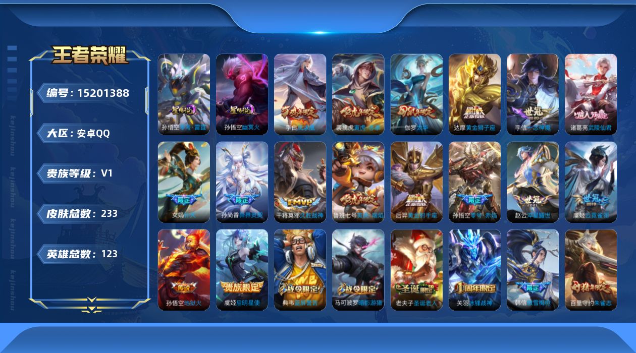 [15201388]【店主推荐捡漏号!可直接换绑安卓Q-V8-荣耀黄金IV段位-121英雄-233皮肤-2星元-16传说-64史诗 【英雄全皮】:猪八戒全皮 【荣耀典藏】:武则天英雄 【传说皮肤】:女娲补天,裴擒虎寅虎赤拳,鲁班七号寅虎瑞焰,孙尚香异界灵契,赵云淬星耀世,虞姬启明星使,孙悟空零号赤焰,李信一念神魔,伽罗太华,干将莫邪久胜战神,虞姬云霓雀翎,达摩黄金狮子座,后羿黄金射手座,诸葛亮武陵仙君,李白凤求凰,孙悟空地狱火 【限定皮肤】:白起狰,狄仁杰阴阳师,赵云皇家上将,赵云百木心枪,墨子神迹守卫,嬴政优雅恋人,嬴政白昼王子,孙尚香蔷薇恋人,孙尚香异界灵契,鲁班七号狮舞东方,鲁班七号寅虎瑞焰,庄周高山流水,白起夜都怪侠,芈月重明,芈月幻夜卜梦,吕布猎兽之王,周瑜赤莲之焰,夏侯惇朔风刀,甄姬女儿国国王,甄姬游园惊梦,曹操烛龙,典韦穷奇,典韦蓝屏警告,马可波罗暗影游猎,狄仁杰魔术师,狄仁杰万华元夜,达摩星际陆战队,达摩沙漠行僧,项羽海滩派对,老夫子圣诞老人,老夫子醍醐杖,老夫子航海奇遇记,关羽冰锋战神,程咬金演武夺筹,韩信傲雪梅枪,兰陵王驯魔猎人,兰陵王金庭之子,亚瑟狮心王,孙悟空零号赤焰,牛魔御旌,后羿圣弓游侠,李元芳银河之约,虞姬启明星使,钟馗神迹守卫,钟馗驱傩正仪,杨玉环遇见飞天,女娲朔望之晖,女娲补天,干将莫邪胡桃夹子,干将莫邪真爱魔法,雅典娜单词大作战,雅典娜黎明之约,蔡文姬繁星吟游,太乙真人饕餮,鬼谷子原初探秘者,鬼谷子五谷丰年,诸葛亮武陵仙君,黄忠火炮绅士,苏烈千军破阵,百里玄策原初追逐者,百里守约朱雀志,弈星混沌棋,沈梦溪星空之诺,沈梦溪大漠名商,明世隐疑决卦,裴擒虎李小龙,裴擒虎寅虎赤拳,狂铁御狮,米莱狄御霄,米莱狄胡桃异想国,云中君纤云弄巧,伽罗太华,盾山御銮,猪八戒西部大镖客,猪八戒猪悟能,上官婉儿梁祝,嫦娥拒霜思,蒙犽狂想玩偶喵,鲁班大师探海日志,桑启海盐诗旅,艾琳女武神,鬼谷子天穹祈灯,刘邦剑破天穹,程咬金群星魔术团,周瑜熔金海岸 【年限皮肤】:百里守约朱雀志,裴擒虎寅虎赤拳,鲁班七号寅虎瑞焰,李白凤求凰,伽罗太华 【赛季限定】:白起狰,芈月重明,夏侯惇朔风刀,曹操烛龙,典韦穷奇,狄仁杰万华元夜,达摩沙漠行僧,老夫子醍醐杖,程咬金演武夺筹,兰陵王金庭之子,亚瑟狮心王,牛魔御旌,钟馗驱傩正仪,雅典娜黎明之约,太乙真人饕餮,鬼谷子原初探秘者,苏烈千军破阵,百里
