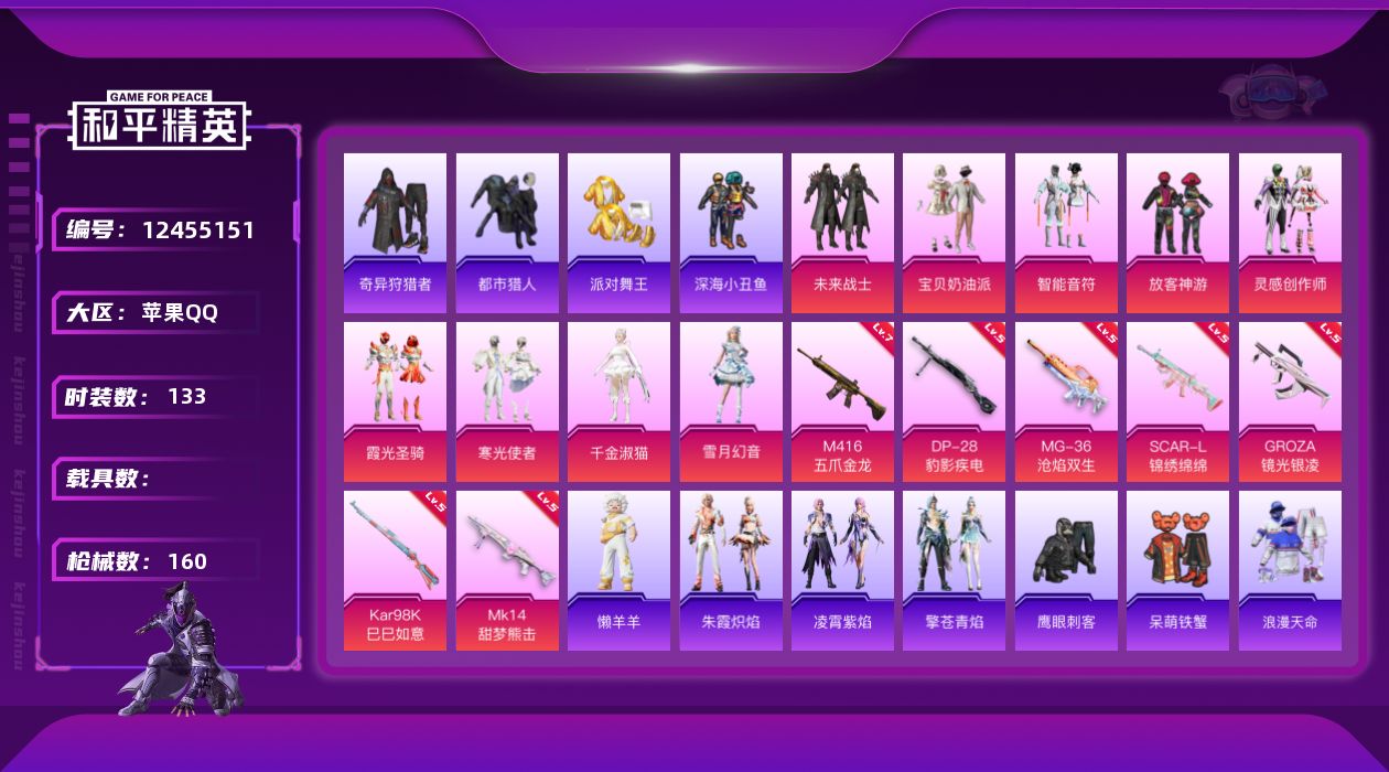 [12455151]【817】苹果 手Q-9粉装-7特效枪-0载具-3粉色飞行器-53958热力值-10王牌印记-133套装-160枪皮