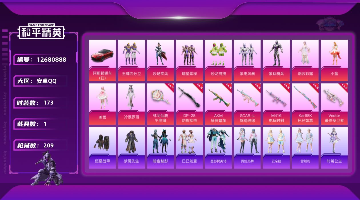 [12680888]【1128】安卓 手Q-10粉装-7特效枪-1载具-3粉色飞行器-71214热力值-11王牌印记-173套装-209枪皮 【粉色载具】:阿斯顿马丁DBS(红) 【粉色套装】:粉装-王牌四分卫,粉装-沙场疾风,粉装-暗星紫秘,粉装-恐龙拽拽,粉装-紫电风暴,角色-紫钛骑兵,角色-烟云彩露,角色-小蓝,角色-美雪,角色-冷漠罗丽 【粉色枪皮等级】:AKM-绿萝繁花(五级),SCAR-L-锦绣绵绵(五级),M416-电玩时刻(五级),Vector-最终圣卫者(三级),Kar98K-巳巳如意(五级),DP-28-豹影疾电(五级),平底锅-林间仙鹿(七级) 【粉色枪皮】:AKM-绿萝繁花,SCAR-L-锦绣绵绵,M416-电玩时刻,Vector-最终圣卫者,Kar98K-巳巳如意,DP-28-豹影疾电,平底锅-林间仙鹿 【粉色飞行器】:古堡领主飞行器,四圣焕新飞行器,终晖之翼飞行器 【粉色降落伞】:四圣焕新降落伞,心之恋语降落伞,马卡龙降落伞,怪笑疯兔降落伞,暗夜玫瑰降落伞,莲影清波降落伞,精灵梦叶罗丽降落伞,星穹咏叹调降落伞,最终圣卫者降落伞,冷漠罗丽降落伞 【稀有套装】:套装-巳巳如意,套装-星影赞美诗,套装-霓虹热舞,套装-云朵鹅,套装-雪绒豹,角色-时希公主,角色-乐音 【稀有枪皮】:AKM-冰凉西瓜,AKM-四圣焕新,AKM-夜灯,AKM-彩虹符号,AKM-星之彼岸,AKM-江南烟雨,AKM-玉龙,AKM-生命誓言,AKM-破晓战魂,AKM-萌趣颜团子,AKM-虎虎生威,AKM-霓虹街区,AKM-龙的传人,M16A4-夜灯,M16A4-幻世战舞者,M16A4-红色方程式,M16A4-蓝色火焰,M16A4-最终圣卫者,SCAR-L-夏日绵绵冰,SCAR-L-炫彩节奏,SCAR-L-玉兔迎春,SCAR-L-红色方程式,SCAR-L-黄金龙骨,SCAR-L-冷漠罗丽,M416-夜灯,M416-糯团青竹,M416-红色方程式,M416-绯红前夜,M416-蓝色火焰,GROZA-异彩先驱,GROZA-彩虹符号,GROZA-春暖花开,GROZA-治愈之星,GROZA-生命誓言,GROZA-黑色刀锋,AUG-耀粉歌者,AUG-青春冒险家,QBZ-原初圣火,QBZ-彩虹符号,QBZ-飞驰魅影,M762-牛气冲天,M762-瑞龙福将,M762-生命誓言,M762-绯红前夜,M762