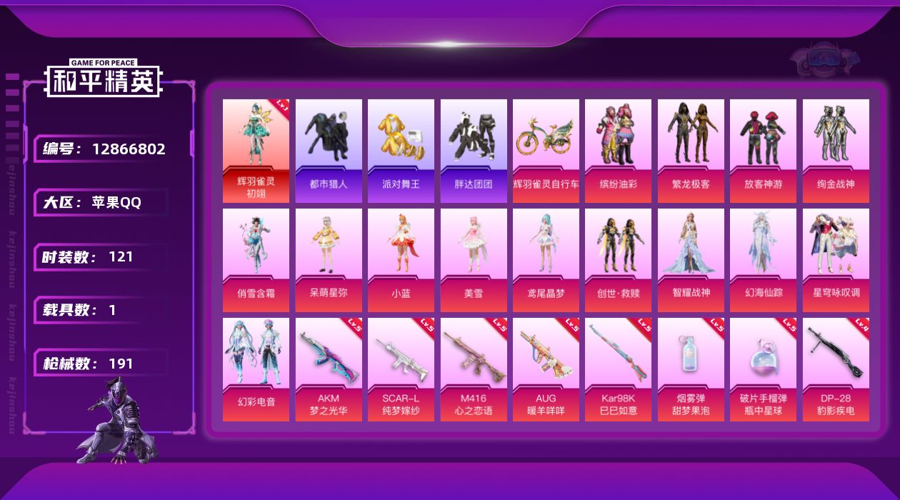 [12866802]【1243】苹果 手Q-1神装-14粉装-13特效枪-1载具-4粉色飞行器-61387热力值-8王牌印记-121套装-191枪皮