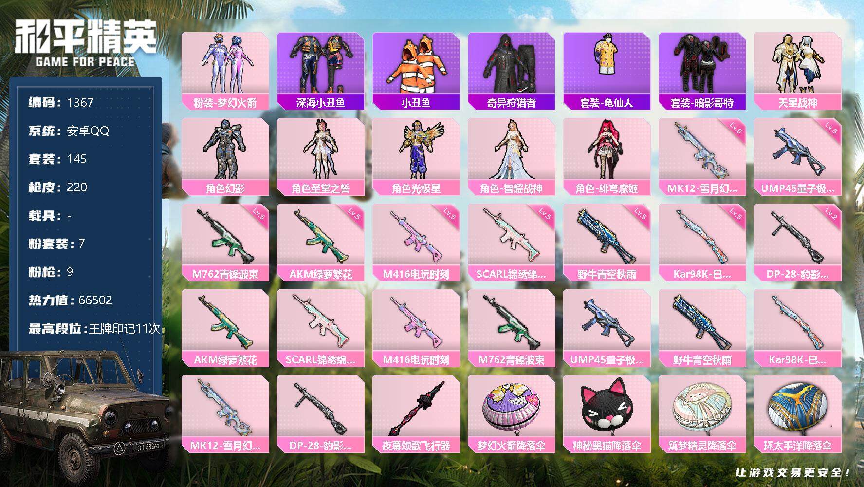 [13014854]【1367】安卓 手Q-7粉装-9特效枪-0载具-2粉色飞行器-66502热力值-11王牌印记-145套装-220枪皮 【热门品类】:粉装-梦幻火箭,套装-深海小丑鱼,套装-小丑鱼,套装-奇异狩猎者,套装-龟仙人,套装-暗影哥特 【粉色套装】:粉装-梦幻火箭,粉装-天星战神,角色-幻影,角色-圣堂之誓,角色-光极星,角色-智耀战神,角色-绯穹魔姬 【粉色枪皮等级】:AKM-绿萝繁花(五级),SCAR-L-锦绣绵绵(五级),M416-电玩时刻(五级),M762-青锋波束(五级),UMP45-量子极限(五级),野牛-青空秋雨(五级),Kar98K-巳巳如意(五级),MK12-雪月幻音(六级),DP-28-豹影疾电(二级) 【粉色枪皮】:AKM-绿萝繁花,SCAR-L-锦绣绵绵,M416-电玩时刻,M762-青锋波束,UMP45-量子极限,野牛-青空秋雨,Kar98K-巳巳如意,MK12-雪月幻音,DP-28-豹影疾电 【粉色飞行器】:夜幕颂歌飞行器 【粉色降落伞】:梦幻火箭降落伞,神秘黑猫降落伞,筑梦精灵降落伞,环太平洋降落伞,垂柳戏鸭降落伞,音爆索尼克降落伞,未来歌姬降落伞,鎏金朋克降落伞,忍者神龟降落伞,雪月幻音降落伞,智耀战神降落伞 【稀有套装】:套装-龟仙人,套装-巳巳如意,套装-雏菊兔兔,套装-萝兰蝴蝶,套装-小熊娃娃,套装-樱梦幻音,套装-粉恋花,套装-紫幽梦,套装-蓝冰羽,角色-猎影月神,角色-瑰梦爱神,套装-彩虹兔,套装-云朵鹅,套装-雪绒豹,套装-蜜露汐语,套装-朱霞炽焰,套装-凌霄紫焰,玩偶服-美羊羊 【稀有枪皮】:AKM-2P战斗服款,AKM-恐龙拽拽,AKM-江南烟雨,AKM-灼热熔岩,AKM-破晓战魂,AKM-筑梦精灵,AKM-虎虎生威,AKM-霓虹街区,AKM-龙的传人,M16A4-幻世战舞者,M16A4-甜心亚梦,SCAR-L-炫彩节奏,SCAR-L-玉兔迎春,SCAR-L-红色方程式,SCAR-L-黄金龙骨,SCAR-L-冷漠罗丽,M416-糯团青竹,M416-紫翼圣骑,M416-红色方程式,M416-绯红前夜,M416-蓝色火焰,GROZA-异彩先驱,GROZA-彩虹符号,GROZA-懵萌河马,AUG-耀粉歌者,QBZ-彩虹符号,QBZ-未来歌姬,QBZ-飞驰魅影,M762-天星战神,M762-天降萌叽,M762-橘柚倾心,M762-