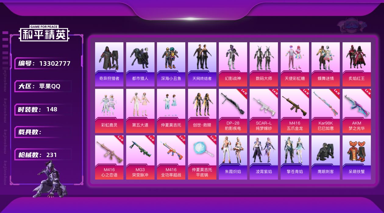 [13302777]【1429】苹果 手Q-9粉装-9特效枪-0载具-2粉色飞行器-64556热力值-12王牌印记-148套装-231枪皮