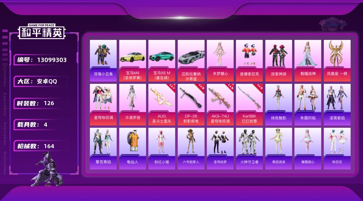 [13099303]【1495】安卓 手Q-7粉装-4特效枪-4载具-1粉色飞行器-55783热力值-5王牌印记-126套装-164枪皮 【热门品类】:粉装-音爆索尼克,套装-深海小丑鱼,套装-龟仙人,套装-粉红小猪,角色-六号稻草人 【粉色载具】:宝马M4(圣保罗黄),宝马X6 M(曼岛绿),迈凯伦塞纳(冷萃蓝),僚机-萌兔起飞 【粉色套装】:粉装-放客神游,粉装-音爆索尼克,角色-智耀战神,角色-凤凰座 一辉,粉装-星穹咏叹调,角色-冷漠罗丽,角色-羊梦糖心 【粉色枪皮等级】:AUG-圣斗士星矢(七级),AKS-74U-星穹咏叹调(五级),Kar98K-巳巳如意(五级),DP-28-豹影疾电(五级) 【粉色枪皮】:AUG-圣斗士星矢,AKS-74U-星穹咏叹调,Kar98K-巳巳如意,DP-28-豹影疾电 【粉色飞行器】:绯果甜心飞行器 【粉色降落伞】:风花雪月降落伞,暗夜鎏金降落伞,镜光幻境降落伞,未来领航者降落伞,智耀战神降落伞,绯果甜心降落伞,星穹咏叹调降落伞,幻星舰长降落伞,幻彩电音降落伞,时光之吻降落伞,冷漠罗丽降落伞,绯穹魔姬降落伞,无垠阁降落伞,喜羊羊与灰太狼降落伞 【稀有套装】:套装-龟仙人,套装-圣穹绘梦,套装-火种守卫者,套装-青团波波,角色-糖霜甜心,套装-粉恋花,套装-紫幽梦,套装-蓝冰羽,角色-瑰梦爱神,角色-六号稻草人,套装-星影赞美诗,套装-星渊小夜曲,套装-彩虹兔,套装-云朵鹅,套装-雪绒豹,角色-灵公主,角色-乐音,角色-绛羽幽主,套装-朱霞炽焰,套装-凌霄紫焰,套装-擎苍青焰,角色-绯色魅影 【稀有枪皮】:AKM-夜灯,AKM-彩虹符号,AKM-星兔领航员,AKM-灼热熔岩,M16A4-幻世战舞者,M16A4-蓝色火焰,SCAR-L-夜灯,SCAR-L-玉兔迎春,SCAR-L-红色方程式,M416-糯团青竹,M416-红色方程式,M416-绯红前夜,M416-蓝色火焰,GROZA-田园牧歌,AUG-耀粉歌者,QBZ-彩虹符号,M762-天降萌叽,M762-绯红前夜,M762-云朵鹅,G36C-星穹咏叹调,AC-VAL-天降萌叽,蜜獾-天降萌叽,蜜獾-绯穹魔姬,蜜獾-御兔特攻,ARX-凌霄紫焰,UZI-啾咪啾咪,UZI-天降萌叽,UZI-影袭,UZI-红色方程式,UMP45-夜灯,UMP45-涂山之恋,UMP45-蓝色火焰,UMP45-圣穹绘梦,