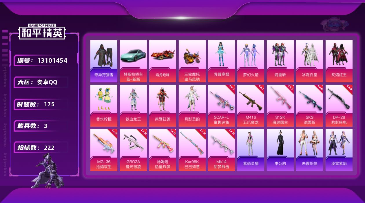 [13101454]【1504】安卓 手Q-9粉装-10特效枪-3载具-2粉色飞行器-81092热力值-13王牌印记-175套装-222枪皮 【热门品类】:粉装-梦幻火箭,套装-浪漫天命,套装-小丑鱼,套装-奇异狩猎者,套装-龟仙人,套装-暗影哥特,套装-浪漫波比 【粉色载具】:特斯拉Roadster(水滴蓝),焰龙咆哮,鬼马风驰,空客H135-蔚蓝之翼 【粉色套装】:粉装-梦幻火箭,粉装-诡面斩,粉装-冰霜白皇,粉装-炙焰红王,粉装-香水柠檬,粉装-铁血龙王,粉装-桀骜红莲,角色-月影灵韵,角色-异瞳寒姬 【粉色枪皮等级】:SCAR-L-童趣迷兔(七级),M416-五爪金龙(七级),GROZA-镜光银凌(五级),汤姆逊-热量炸弹(五级),Kar98K-巳巳如意(五级),SKS-诡面斩(六级),Mk14-甜梦熊击(五级),S12K-海渊国主(七级),DP-28-豹影疾电(五级),MG-36-沧焰双生(五级) 【粉色枪皮】:SCAR-L-童趣迷兔,M416-五爪金龙,GROZA-镜光银凌,汤姆逊-热量炸弹,Kar98K-巳巳如意,SKS-诡面斩,Mk14-甜梦熊击,S12K-海渊国主,DP-28-豹影疾电,MG-36-沧焰双生 【粉色飞行器】:诡面斩飞行器,童趣迷兔飞行器 【粉色降落伞】:深海曼妙降落伞,百万伏特降落伞,诡面斩降落伞,阿狸红降落伞,夏日绵绵冰降落伞,银刃赛罗降落伞,香水柠檬降落伞,王牌四分卫降落伞,星之彼岸降落伞,怪笑疯兔降落伞,暗夜玫瑰降落伞,旋转彩虹降落伞,星穹咏叹调降落伞,异瞳寒姬降落伞 【稀有套装】:套装-龟仙人,套装-巳巳如意,套装-小鸟芋圆,套装-雏菊兔兔,套装-萝兰蝴蝶,角色-狂花道·娜可露露,套装-糖糖葫芦,套装-青团波波,套装-棉花软糖,套装-燕燕于飞,套装-鱼渊荷华,套装-粉恋花,套装-紫幽梦,套装-蓝冰羽,套装-星影赞美诗,套装-星渊小夜曲,套装-彩虹兔,套装-云朵鹅,套装-雪绒豹,套装-朱霞炽焰,套装-凌霄紫焰,套装-擎苍青焰,角色-申公豹,角色-紫俏灵猫 【稀有枪皮】:AKM-冰凉西瓜,AKM-夜灯,AKM-彩虹符号,AKM-破晓战魂,AKM-缤纷海域,AKM-萌趣颜团子,AKM-虎虎生威,AKM-霓虹街区,AKM-龙的传人,SCAR-L-夏日绵绵冰,SCAR-L-浪客战士,SCAR-L-炫彩节奏,SCAR-L-王牌四分卫,M416-滑板小狐,
