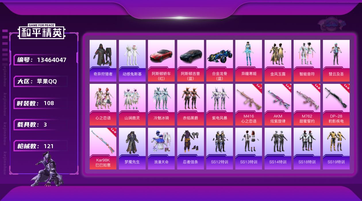 [13464047]【1537】苹果 手Q-9粉装-5特效枪-3载具-2粉色飞行器-47447热力值-9王牌印记-108套装-121枪皮 【热门品类】:套装-浪漫天命,套装-奇异狩猎者,套装-忍者信条,套装-动感兔斯基人偶服 【粉色载具】:阿斯顿马丁DBS(红),阿斯顿马丁DBX(蓝),合金龙骨(蓝) 【粉色套装】:粉装-金风玉露,粉装-智能音符,粉装-彗云及圣,粉装-心之恋语,粉装-山涧鹿灵,粉装-冷魅冰骑,粉装-赤焰黑爵,粉装-紫电风暴,角色-异瞳寒姬 【粉色枪皮等级】:AKM-炫紫旋律(六级),M416-心之恋语(七级),M762-甜蜜誓约(六级),Kar98K-巳巳如意(四级),DP-28-豹影疾电(四级) 【粉色枪皮】:AKM-炫紫旋律,M416-心之恋语,M762-甜蜜誓约,Kar98K-巳巳如意,DP-28-豹影疾电 【粉色飞行器】:心之恋语飞行翼,冷魅冰骑飞行器 【粉色降落伞】:炫紫旋律降落伞,古堡领主降落伞,繁花小夜曲降落伞,甜蜜誓约降落伞,四圣焕新降落伞,马卡龙降落伞,银刃赛罗降落伞,暗翼战神降落伞,冷魅冰骑降落伞,太空嘟嘟降落伞,未来歌姬降落伞 【稀有枪皮】:AKM-四圣焕新,AKM-龙的传人,M16A4-机械英豪,SCAR-L-炫彩节奏,SCAR-L-玉兔迎春,SCAR-L-甜蜜誓约,SCAR-L-繁花小夜曲,SCAR-L-黄金龙骨,M416-动感兔斯基,M416-糯团青竹,GROZA-2B战斗服款,GROZA-治愈之星,AUG-青春冒险家,QBZ-原初圣火,QBZ-彩虹符号,QBZ-未来歌姬,QBZ-潮汐统领,QBZ-飞驰魅影,M762-动感兔斯基,G36C-冷魅冰骑,G36C-动感兔斯基,AC-VAL-天降萌叽,AC-VAL-闲梦青缨,蜜獾-天降萌叽,UZI-古堡领主,UMP45-夜灯,UMP45-生命誓言,UMP45-诡娃娃,Vector-彩虹符号,Vector-治愈之星,汤姆逊-天降萌叽,汤姆逊-奇异狩猎者,汤姆逊-炫彩节奏,野牛-动感兔斯基,野牛-机械英豪,MP5K-甜蜜誓约,MP5K-繁花小夜曲,AKS-74U-鬼刀,P90-飞驰魅影,Kar98K-古堡领主,Kar98K-炫彩节奏,Kar98K-王子的夏天,Kar98K-飞驰魅影,M24-治愈之星,M24-冰封烈焰,M24-动感兔斯基,SKS-炫彩节奏,SKS-诡娃娃,VSS-碧影闪光,VSS-繁