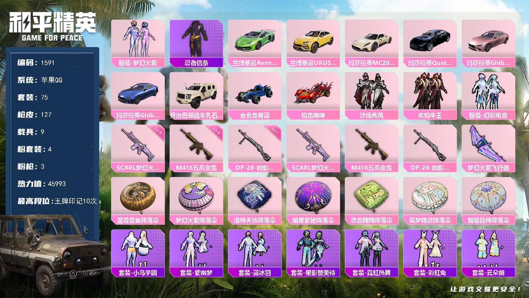 [14224856]【1591】苹果 手Q-4粉装-3特效枪-9载具-1粉色飞行器-45993热力值-10王牌印记-75套装-127枪皮