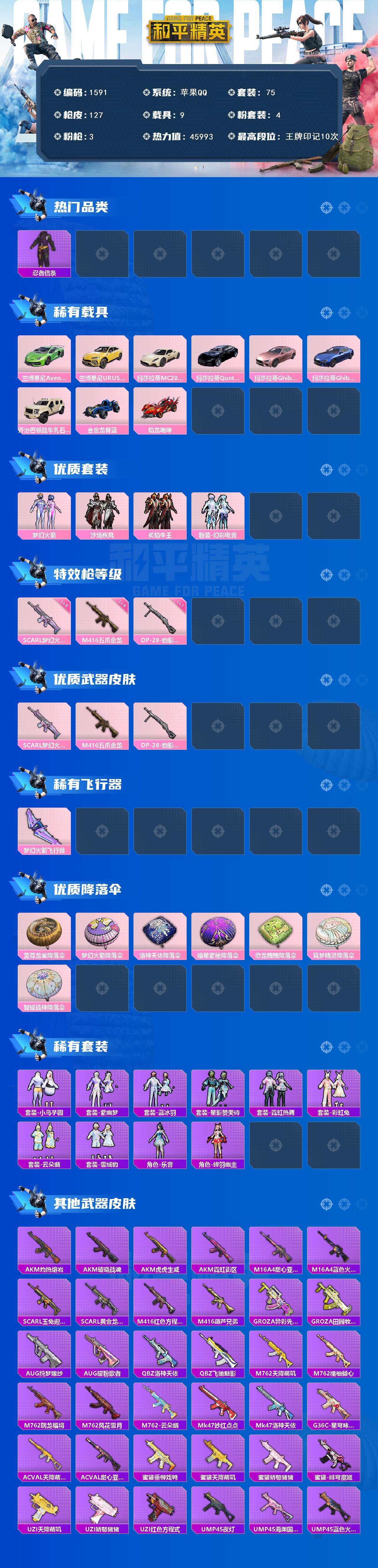 [14224856]【1591】苹果 手Q-4粉装-3特效枪-9载具-1粉色飞行器-45993热力值-10王牌印记-75套装-127枪皮 【热门品类】:粉装-梦幻火箭,套装-忍者信条 【粉色载具】:兰博基尼Aventador SVJ(翡翠绿),兰博基尼URUS(明艳黄),玛莎拉蒂MC20(星石白),玛莎拉蒂Quattroporte(夜幕蓝),玛莎拉蒂Ghibli(粉),玛莎拉蒂Ghibli(蓝),乔治巴顿战车(乳石白),合金龙骨(蓝),焰龙咆哮 【粉色套装】:粉装-梦幻火箭,粉装-沙场疾风,粉装-炙焰牛王,粉装-幻彩电音 【粉色枪皮等级】:SCAR-L-梦幻火箭(六级),M416-五爪金龙(六级),DP-28-豹影疾电(一级) 【粉色枪皮】:SCAR-L-梦幻火箭,M416-五爪金龙,DP-28-豹影疾电 【粉色飞行器】:梦幻火箭飞行器 【粉色降落伞】:至尊龙雀降落伞,梦幻火箭降落伞,洛神天依降落伞,暗星紫秘降落伞,恐龙拽拽降落伞,筑梦精灵降落伞,智耀战神降落伞 【稀有套装】:套装-小鸟芋圆,套装-紫幽梦,套装-蓝冰羽,套装-星影赞美诗,套装-霓虹热舞,套装-彩虹兔,套装-云朵鹅,套装-雪绒豹,角色-乐音,角色-绛羽幽主 【稀有枪皮】:AKM-灼热熔岩,AKM-破晓战魂,AKM-虎虎生威,AKM-霓虹街区,M16A4-甜心亚梦,M16A4-蓝色火焰,SCAR-L-玉兔迎春,SCAR-L-黄金龙骨,M416-红色方程式,M416-葫芦兄弟,GROZA-异彩先驱,GROZA-田园牧歌,AUG-纯梦嫁纱,AUG-耀粉歌者,QBZ-洛神天依,QBZ-飞驰魅影,M762-天降萌叽,M762-橘柚倾心,M762-瑞龙福将,M762-风花雪月,M762-云朵鹅,Mk47-妙红点点,Mk47-洛神天依,G36C-星穹咏叹调,AC-VAL-天降萌叽,AC-VAL-甜心亚梦,蜜獾-垂柳戏鸭,蜜獾-天降萌叽,蜜獾-娇憨猪猪,蜜獾-绯穹魔姬,UZI-天降萌叽,UZI-娇憨猪猪,UZI-红色方程式,UMP45-夜灯,UMP45-海渊国主,UMP45-蓝色火焰,Vector-生命誓言,Vector-田园牧歌,Vector-音爆索尼克,汤姆逊-幻影战神,汤姆逊-异彩先驱,汤姆逊-暗夜鎏金,汤姆逊-炫彩节奏,汤姆逊-耀粉歌者,野牛-夜灯,MP5K-异彩先驱,MP5K-蓝莓炮弹,AKS-74U-辉羽雀灵,P90-飞驰