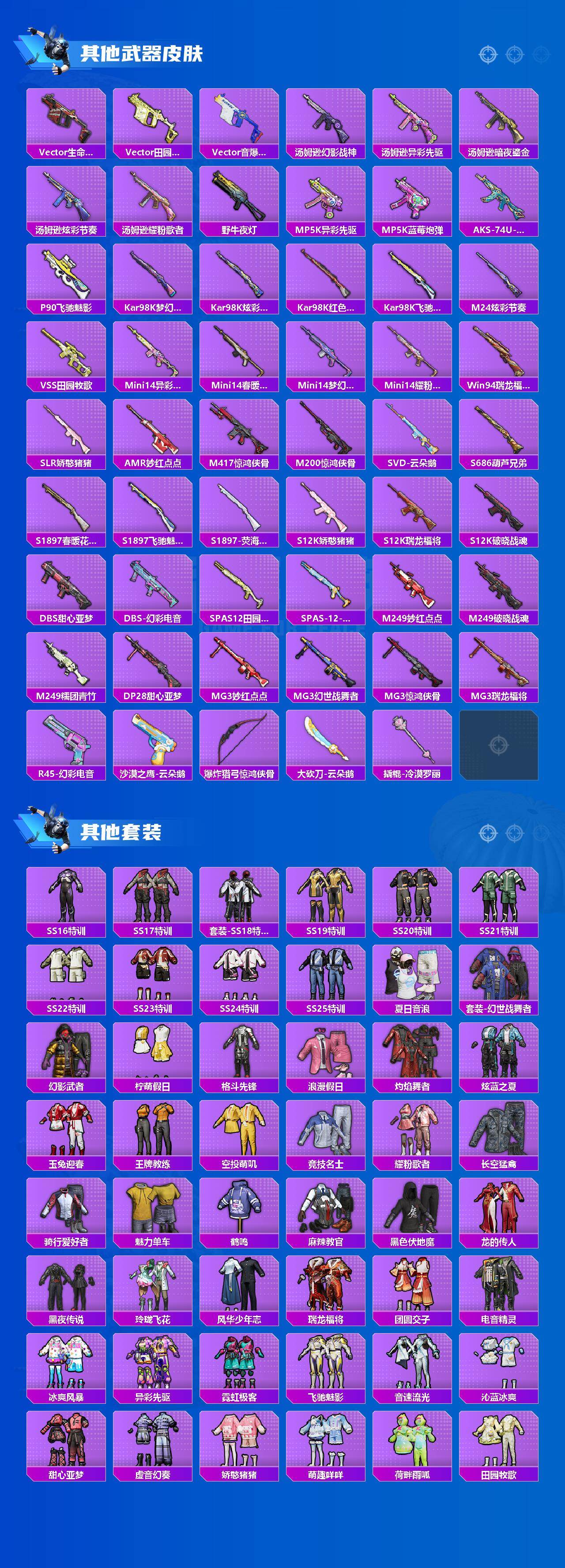 - [13868285]安卓 手Q-9粉装-4特效枪-4载具-2粉色飞行器-32820热力值-1王牌印记-58套装-69枪皮 【热门品类】:粉装-梦幻火箭,粉装-童趣迷兔,套装-粉红小猪 【粉色载具】:路特斯ELETRE(冰川蓝),玛莎拉蒂MC20(星石白),玛莎拉蒂Quattroporte(夜幕蓝),海龙奔腾,僚机-萌兔起飞 【粉色套装】:粉装-宝贝奶油派,粉装-天使彩虹糖,粉装-梦幻火箭,粉装-冰霜白皇,粉装-童趣迷兔,粉装-海盐物语,粉装-傲雪凌霜,粉装-霁雪冰心,粉装-彩虹甜喵 【粉色枪皮等级】:AKM-甜心宝贝(四级),M16A4-垂柳戏鸭(二级),SCAR-L-梦幻火箭(四级),M249-绒雪飘舞(三级) 【粉色枪皮】:AKM-甜心宝贝,M16A4-垂柳戏鸭,SCAR-L-梦幻火箭,M249-绒雪飘舞 【粉色飞行器】:梦幻火箭飞行器,千面幻镜飞行器 【粉色降落伞】:百万伏特降落伞,甜心宝贝降落伞,梦幻火箭降落伞,闪光银龙降落伞,绒雪飘舞降落伞,垂柳戏鸭降落伞,灵感创作师降落伞,彩虹甜喵降落伞,旋转彩虹降落伞 【稀有枪皮】:AKM-破晓战魂,AKM-龙的传人,M16A4-幻世战舞者,M16A4-甜心亚梦,SCAR-L-玉兔迎春,SCAR-L-银碳小老虎,M416-暗夜行者,M416-糯团青竹,M416-红色方程式,GROZA-彩虹符号,GROZA-治愈之星,GROZA-田园牧歌,AUG-耀粉歌者,M762-天降萌叽,M762-彩虹甜喵,M762-甜心宝贝,M762-绒雪飘舞,AC-VAL-灵感创作师,AC-VAL-甜心亚梦,蜜獾-垂柳戏鸭,蜜獾-娇憨猪猪,UZI-娇憨猪猪,UMP45-生命誓言,UMP45-蓝色火焰,Vector-生命誓言,Vector-田园牧歌,汤姆逊-耀粉歌者,MP5K-甜蜜誓约,P90-翩跹演武,P90-飞驰魅影,Kar98K-梦幻火箭,M24-炫彩节奏,AWM-垂柳戏鸭,VSS-田园牧歌,Mini14-梦幻火箭,Mk14-相思残雪,Mk14-童趣迷兔,SLR-娇憨猪猪,AMR-暗夜行者,M417-绒雪飘舞,S1897-炫彩节奏,S12K-垂柳戏鸭,S12K-娇憨猪猪,S12K-幻世战舞者,DBS-甜心亚梦,SPAS-12-太空嘟嘟,SPAS-12-田园牧歌,M249-破晓战魂,DP-28-甜心亚梦,DP-28-甜心宝贝,MG3-幻世战舞者,P1911-冰