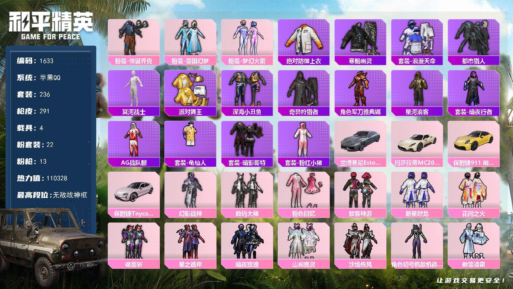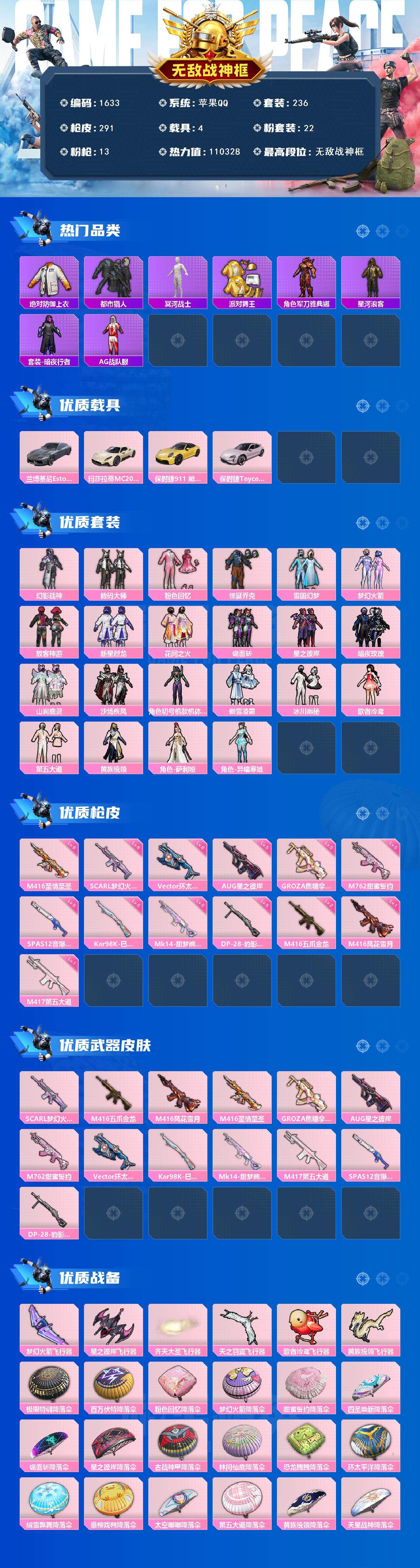 [14542614]【1633】苹果 手Q-无敌战神框-22粉装-13特效枪-4载具-8粉色飞行器-110328热力值-17王牌印记-236套装-291枪皮 【热门品类】:粉装-怪诞乔克,粉装-雪国幻梦,粉装-梦幻火箭,绝对防御上衣,套装-寒蝎幽灵,套装-浪漫天命,套装-都市猎人,套装-冥河战士,套装-派对舞王,套装-深海小丑鱼,套装-奇异狩猎者,角色-军刀雅典娜,套装-星河浪客,套装-暗夜行者,套装-AG战队服,套装-龟仙人,套装-暗影哥特,套装-粉红小猪 【粉色载具】:兰博基尼Estoque(银翼灰),玛莎拉蒂MC20(星石白),保时捷911 敞篷版(极速黄),保时捷Taycan 旅行版(冰莓粉) 【粉色套装】:粉装-幻影战神,粉装-数码大师,粉装-粉色回忆,粉装-怪诞乔克,粉装-雪国幻梦,粉装-梦幻火箭,粉装-放客神游,粉装-新星烈龙,粉装-花间之火,粉装-诡面斩,粉装-星之彼岸,粉装-暗夜玫瑰,粉装-山涧鹿灵,粉装-沙场疾风,角色-初号机款机体服,粉装-傲雪凌霜,粉装-冰川幽秘,角色-歌者泠鸢,粉装-第五大道,粉装-黄族统领,角色-萨利娅,角色-异瞳寒姬 【粉色枪皮等级】:SCAR-L-梦幻火箭(六级),M416-五爪金龙(二级),M416-风花雪月(一级),M416-至情至圣(九级),GROZA-焦糖拿铁(五级),AUG-星之彼岸(五级),M762-甜蜜誓约(五级),Vector-环太平洋(六级),Kar98K-巳巳如意(五级),Mk14-甜梦熊击(五级),M417-第五大道(一级),SPAS-12-音爆索尼克(五级),DP-28-豹影疾电(五级) 【粉色枪皮】:SCAR-L-梦幻火箭,M416-五爪金龙,M416-风花雪月,M416-至情至圣,GROZA-焦糖拿铁,AUG-星之彼岸,M762-甜蜜誓约,Vector-环太平洋,Kar98K-巳巳如意,Mk14-甜梦熊击,M417-第五大道,SPAS-12-音爆索尼克,DP-28-豹影疾电 【粉色飞行器】:梦幻火箭飞行器,星之彼岸飞行器,齐天大圣飞行器,天之羽翼飞行器,歌者泠鸢飞行器,黄族统领飞行器 【粉色降落伞】:极限特训降落伞,百万伏特降落伞,粉色回忆降落伞,梦幻火箭降落伞,甜蜜誓约降落伞,四圣焕新降落伞,诡面斩降落伞,星之彼岸降落伞,古战神甲降落伞,林间仙鹿降落伞,恐龙拽拽降落伞,环太平洋降落伞,绒雪飘舞降落伞,垂柳戏