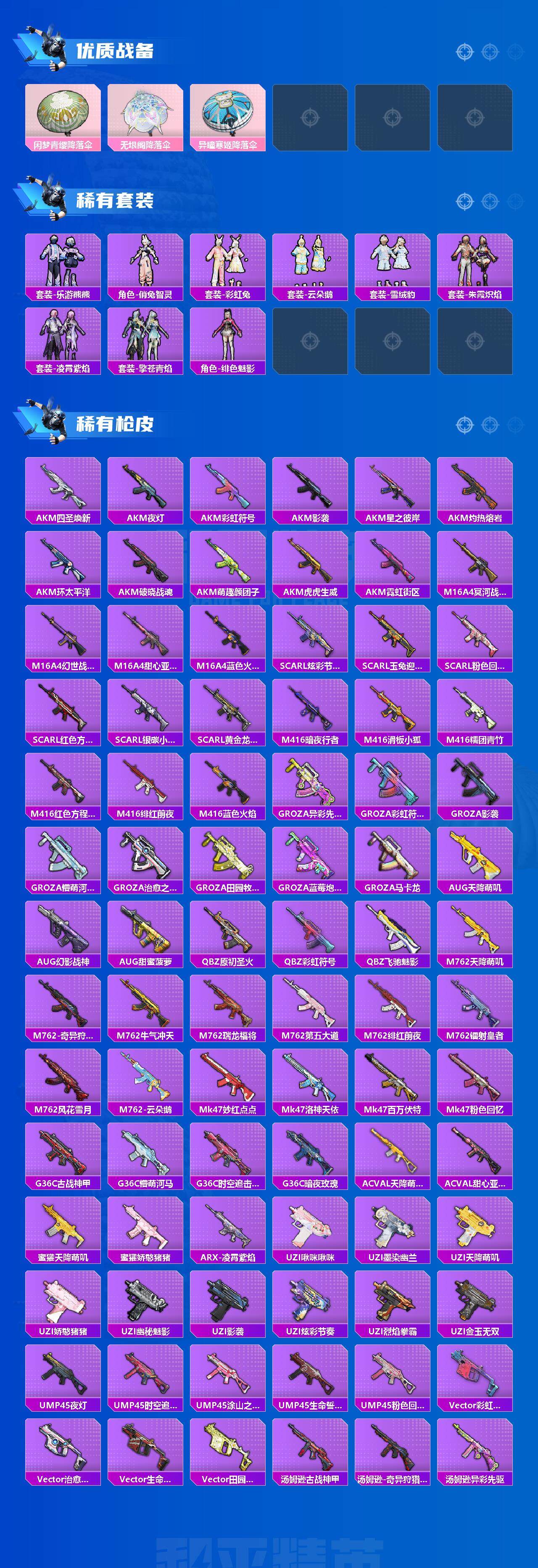 - [11548746]15粉装 10特效枪 3载具 11印记 可二次 可修改实名 身法装备:都市猎人,暗影哥特(红眼罩),萌熊伴侣背包(粉熊背包) 优质装备:宝马X6 M(曼岛绿),玛莎拉蒂Ghibli(粉),甜心巧克力,宾利BATUR(极速紫),都市猎人,萌熊伴侣背包(粉熊背包),M416心之恋语,梦幻火箭(新101)(新火箭少女101粉色套装),宝贝奶油派,天使彩虹糖,SCAR-L童趣迷兔,炙焰红王,冰霜白皇,AUG星之彼岸,UMP45相思残雪(UMP45-相思残雪),相思残雪,AKM梦之光华,P90粉樱探戈,AUG超新星,AKS-74U-信仰神谕,冷漠罗丽,Kar98K-巳巳如意 热门装扮:薄荷物语,傲雪凌霜,海螺星光,仲夏莫吉托,天星战神,幻影,白兰星,兔兔白日梦,胖达圆圆,胖达团团,罗小黑,鹰眼刺客,万圣娃娃,都市猎人 稀有枪皮:DP-28-豹影疾电 六级特效枪:六级M416-心之恋语,六级AKS-74U-信仰神谕 五级特效枪:五级SCAR-L-童趣迷兔,五级Kar98K-巳巳如意,五级DP-28-豹影疾电,五级P90-粉樱探戈,五级AUG-超新星,五级UMP45-相思残雪,五级AKM-梦之光华 一级特效枪:一级AUG-星之彼岸 紫色装扮:田园牧歌,轻风白浪,和煦暖阳,SS22特训,SS23特训,幻彩翩翩,妙红点点,摩登艾咪,香榭午后,娇憨猪猪,梦幻奶油,萌趣咩咩,SS21特训,SS31特训套装,冷焰舞者,SS30特训套装,云朵鹅,彩虹兔,雪绒豹,SS33特训套装,青涩时光,顶瓜瓜,时希公主,SS20特训,星梦畅游,微雨春柳,暖风夏荷,猎梦纪元,飞驰魅影,音速流光,SS19特训,甜心亚梦,虚音幻奏,野性山猫,野性战心,长空猛禽,霓虹街区,青年教官,缤纷果语,街头潮人,飞行日记,魅力单车,麻辣教官,黄色名流,黑色伏地魔,龙的传人,龟仙人,香桃花海,沙漠毒蛇,极地朋克,柠萌假日,海岛探路者,涂山之恋,坚韧舞者,夏日倾情,完美偶像,帅气教官,幻世战舞者,探宝勇士,湖蓝色名流,白熊同盟,白色伏地魔,破晓战魂,破蛋小黄鸡,空岛之星,竞技达人朋克,甜蜜熊情侣,王牌教练,牛气冲天,炫蓝之夏,牛气满满,猛禽,猎鹰,SS29特训,星途旅人,SS28特训,异域银装,鱼渊荷华,玉兔迎春,燕燕于飞,巳巳如意,海琴烟,风玲,青团波波,糖糖葫芦,棉花软糖,竞技名士,摩登魅猫,暗影哥特(红眼罩),街头风暴