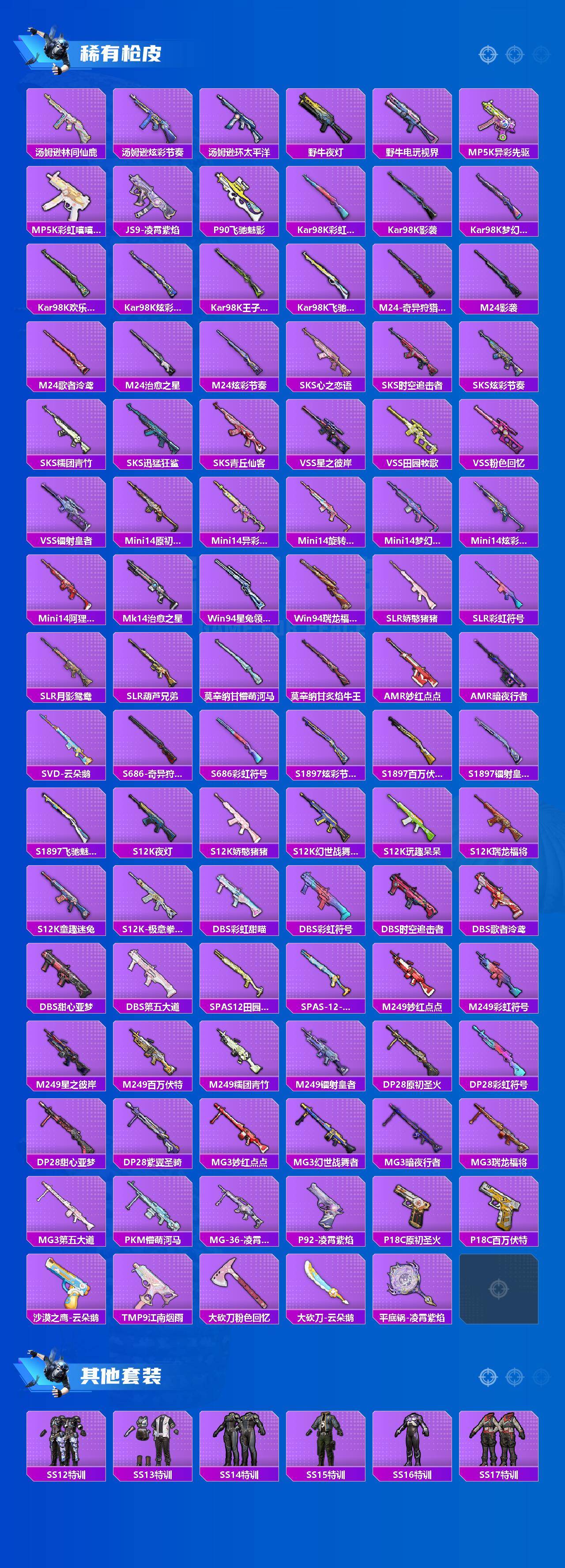 SCAR-L-梦幻火箭,M416-五爪金龙,M416-风花雪月,M416-至情至圣,GROZA-焦糖拿铁,AUG-星之彼岸,M762-甜蜜誓约,Vector-环太平洋,Kar98K-巳巳如意,M417-第五大道,SPAS-12-音爆索尼克