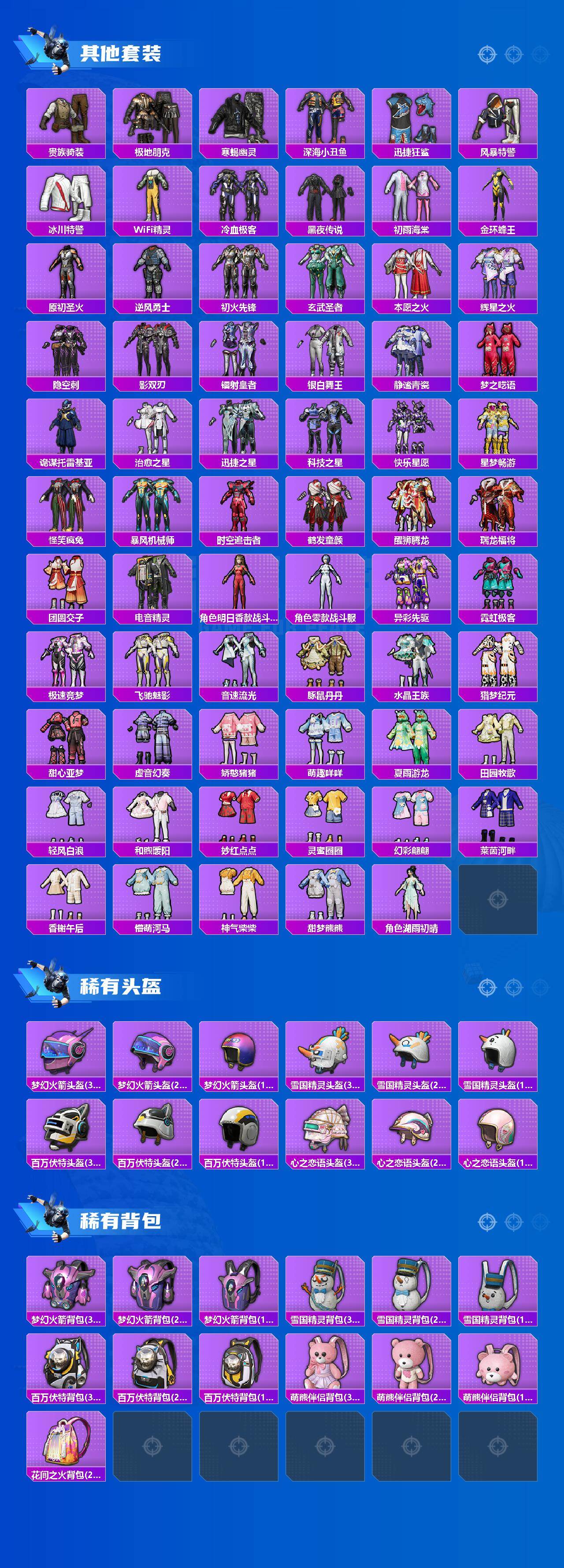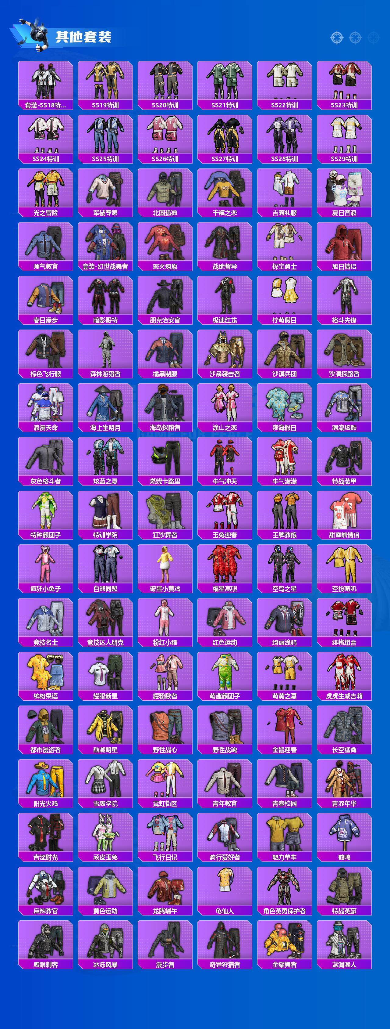 套装-怪诞乔克,套装-雪国幻梦,套装-梦幻火箭,套装-寒蝎幽灵,套装-都市猎人,套装-冥河战士,套装-派对舞王,套装-深海小丑鱼,套装-奇异狩猎者,套装-暗夜行者,套装-幻影战神,套装-数码大师,套装-粉色回忆,套装-放客神游,套装-新星烈龙,套装-花间之火,套装-诡面斩,套装-星之彼岸,套装-暗夜玫瑰,套装-山涧鹿灵,套装-沙场疾风,角色-初号机款机体服,套装-傲雪凌霜,套装-冰川幽秘,角色-歌者泠鸢,套装-第五大道,套装-黄族统领,角色-萨利娅,套装-鹰眼刺客,套装-迅捷狂鲨