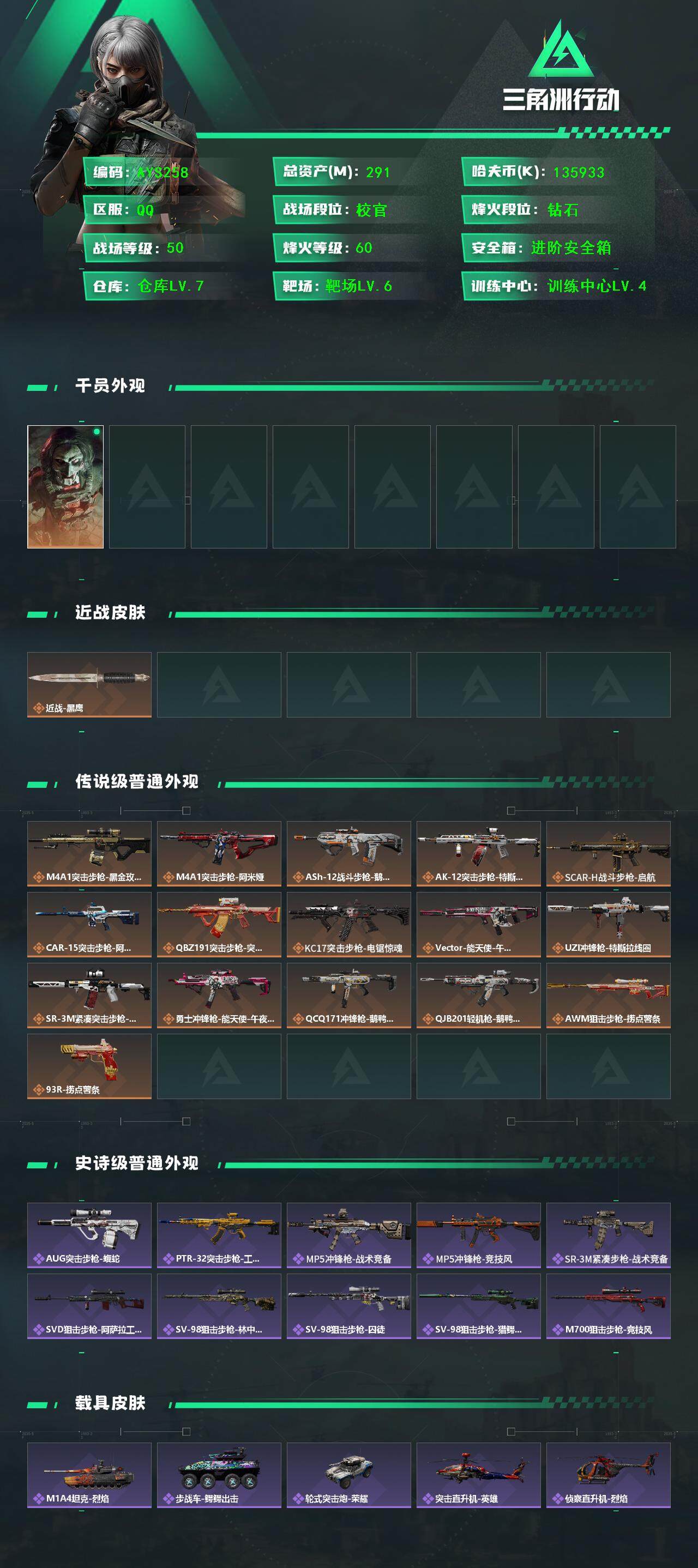 [15371003]可二次【特价出售/店主推荐】291m总资产-135933k哈伏币-60烽火等级-钻石-50战场等级-校官 【干员外观】:红狼-电锯惊魂 【近战皮肤】:近战-黑鹰 【传说外观】:M4A1突击步枪-蚀金玫瑰,M4A1突击步枪-阿米娅,ASh-12战斗步枪-鹅鸭杀,AK-12突击步枪-特斯拉线圈,SCAR-H战斗步枪-启航,CAR-15突击步枪-阿米娅,腾龙突击步枪-捞点薯条,KC17突击步枪-电锯惊魂,Vector冲锋枪-能天使-午夜邮差,UZI冲锋枪-特斯拉线圈,SR-3M紧凑突击步枪-特斯拉线圈,勇士冲锋枪-能天使-午夜邮差,QCQ171冲锋枪-鹅鸭杀,QJB201轻机枪-鹅鸭杀,AWM狙击步枪-捞点薯条,93R-捞点薯条 【史诗外观】:AUG突击步枪-蝮蛇,PTR-32突击步枪-工业狂潮,MP5冲锋枪-战术竞备,MP5冲锋枪-竞技风,SR-3M紧凑突击步枪-战术竞备,SVD狙击步枪-阿萨拉工艺,SV-98狙击步枪-林中猎手,SV-98狙击步枪-囚徒,SV-98狙击步枪-猎鳄行动,M700狙击步枪-竞技风 【稀有外观】:AKM突击步枪-肃杀,QBZ95-1突击步枪-公平竞技,M16A4突击步枪-街头涂鸦,AUG突击步枪-全金属外壳,AUG突击步枪-前沿科技,M7战斗步枪-捣蛋鬼,SCAR-H战斗步枪-荣耀列队,AS Val突击步枪-哈夫克科技,腾龙突击步枪-冰天雪地,MP5冲锋枪-弄臣,MP5冲锋枪-虎啸,MP5冲锋枪-哈夫克卫队,P90冲锋枪-医疗协议,P90冲锋枪-黄昏,P90冲锋枪-捣蛋鬼,Vector冲锋枪-前沿科技,UZI冲锋枪-前沿科技,UZI冲锋枪-亚特兰蒂斯,野牛冲锋枪-前沿科技,野牛冲锋枪-公平竞技,SMG-45-行动开启,SMG-45冲锋枪-幻影结构,M1014霰弹枪-幻影结构,M249轻机枪-战损,QJB201轻机枪-哈夫克卫队,Mini-14射手步枪-荣耀列队,M14射手步枪-出厂配置,SKS射手步枪-弄臣,SR-25射手步枪-开拓,SR9射手步枪-肃杀,SV-98狙击步枪-前沿科技,SV-98狙击步枪-星链科技,SV-98狙击步枪-哈夫克航天,SV-98狙击步枪-精英联盟,G18-星链科技,G18-哈夫克航天 【普通外观】:M4A1突击步枪-粉色涂装,M4A1突击步枪-高雅黑,M4A1突击步枪-海色,QBZ95-1突击步枪-高雅黑,QBZ