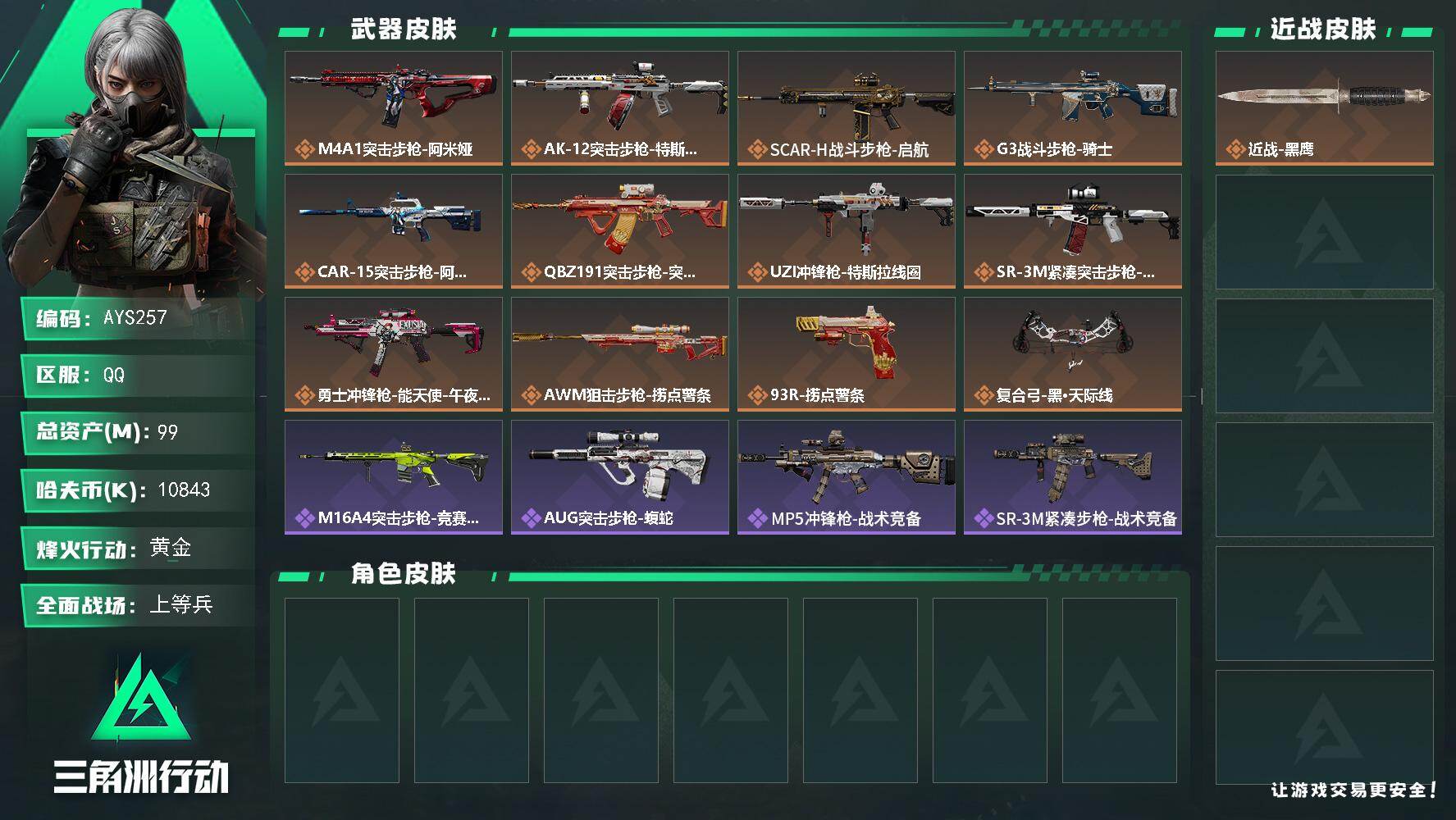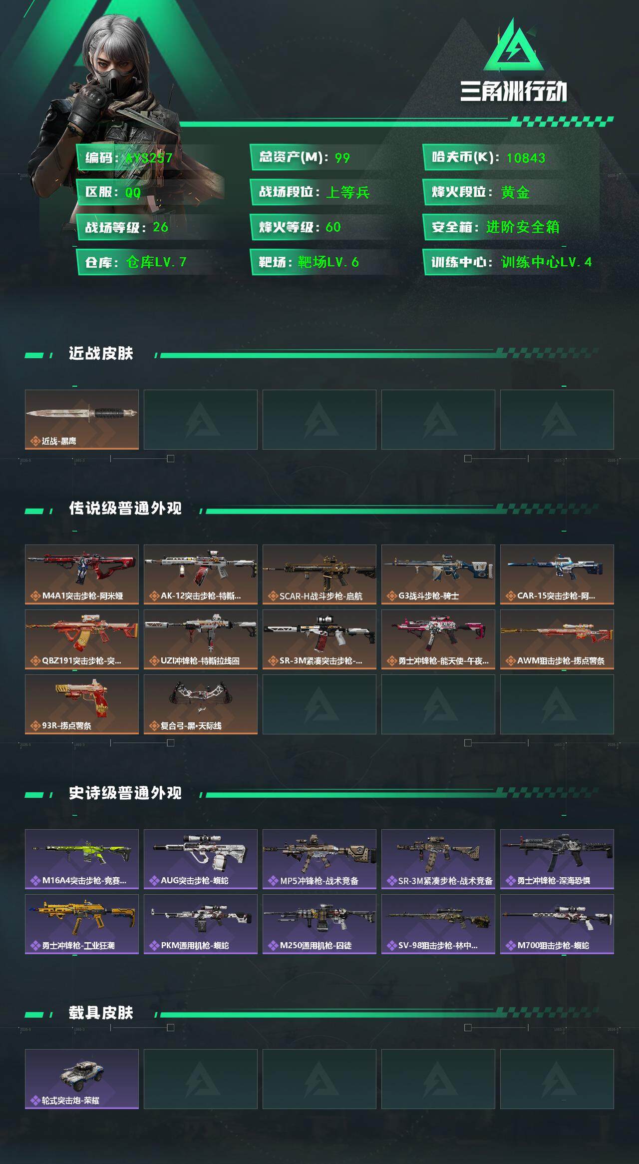[15371013]【特价出售/店主推荐】99m总资产-10843k哈伏币-60烽火等级-黄金-26战场等级-上等兵 【近战皮肤】:近战-黑鹰 【传说外观】:M4A1突击步枪-阿米娅,AK-12突击步枪-特斯拉线圈,SCAR-H战斗步枪-启航,G3战斗步枪-骑士,CAR-15突击步枪-阿米娅,腾龙突击步枪-捞点薯条,UZI冲锋枪-特斯拉线圈,SR-3M紧凑突击步枪-特斯拉线圈,勇士冲锋枪-能天使-午夜邮差,AWM狙击步枪-捞点薯条,93R-捞点薯条,复合弓-黑·天际线 【史诗外观】:M16A4突击步枪-竞赛选手,AUG突击步枪-蝮蛇,MP5冲锋枪-战术竞备,SR-3M紧凑突击步枪-战术竞备,勇士冲锋枪-深海恐惧,勇士冲锋枪-工业狂潮,PKM通用机枪-蝮蛇,M250通用机枪-囚徒,SV-98狙击步枪-林中猎手,M700狙击步枪-蝮蛇 【稀有外观】:SR-3M紧凑突击步枪-花岗岩,QBZ95-1突击步枪-公平竞技,M16A4突击步枪-街头涂鸦,M7战斗步枪-捣蛋鬼,SCAR-H战斗步枪-荣耀列队,腾龙突击步枪-冰天雪地,MP5冲锋枪-弄臣,MP5冲锋枪-虎啸,MP5冲锋枪-哈夫克卫队,UZI冲锋枪-亚特兰蒂斯,SMG-45-行动开启,SMG-45冲锋枪-幻影结构,SMG-45冲锋枪-天网,M1014霰弹枪-幻影结构,QJB201轻机枪-哈夫克卫队,Mini-14射手步枪-荣耀列队,SKS射手步枪-弄臣,SR-25射手步枪-开拓,SR-9射手步枪-街头涂鸦,SV-98狙击步枪-星链科技,SV-98狙击步枪-哈夫克航天,SV-98狙击步枪-精英联盟,G18-星链科技,G18-哈夫克航天 【普通外观】:M4A1突击步枪-粉色涂装,M4A1突击步枪-高雅黑,M4A1突击步枪-海色,QBZ95-1突击步枪-高雅黑,QBZ95-1突击步枪-海浪,QBZ95-1突击步枪-海色,QBZ191突击步枪-三角洲力量,K416突击步枪-几何迷彩,K416突击步枪-高雅黑,M16A4突击步枪-三角洲力量,M16A4突击步枪-山林猎人,M16A4突击步枪-高雅黑,AUG突击步枪-浅蓝涂装,M7战斗步枪-红色涂装,SG552突击步枪-浅蓝涂装,SG552突击步枪-海浪,SCAR-H战斗步枪-数码迷彩,G3战斗步枪-高雅黑,PTR-32突击步枪-黄蜂,MP5冲锋枪-安全工作,MP5冲锋枪-海色,MP5冲锋枪-黄蜂,P