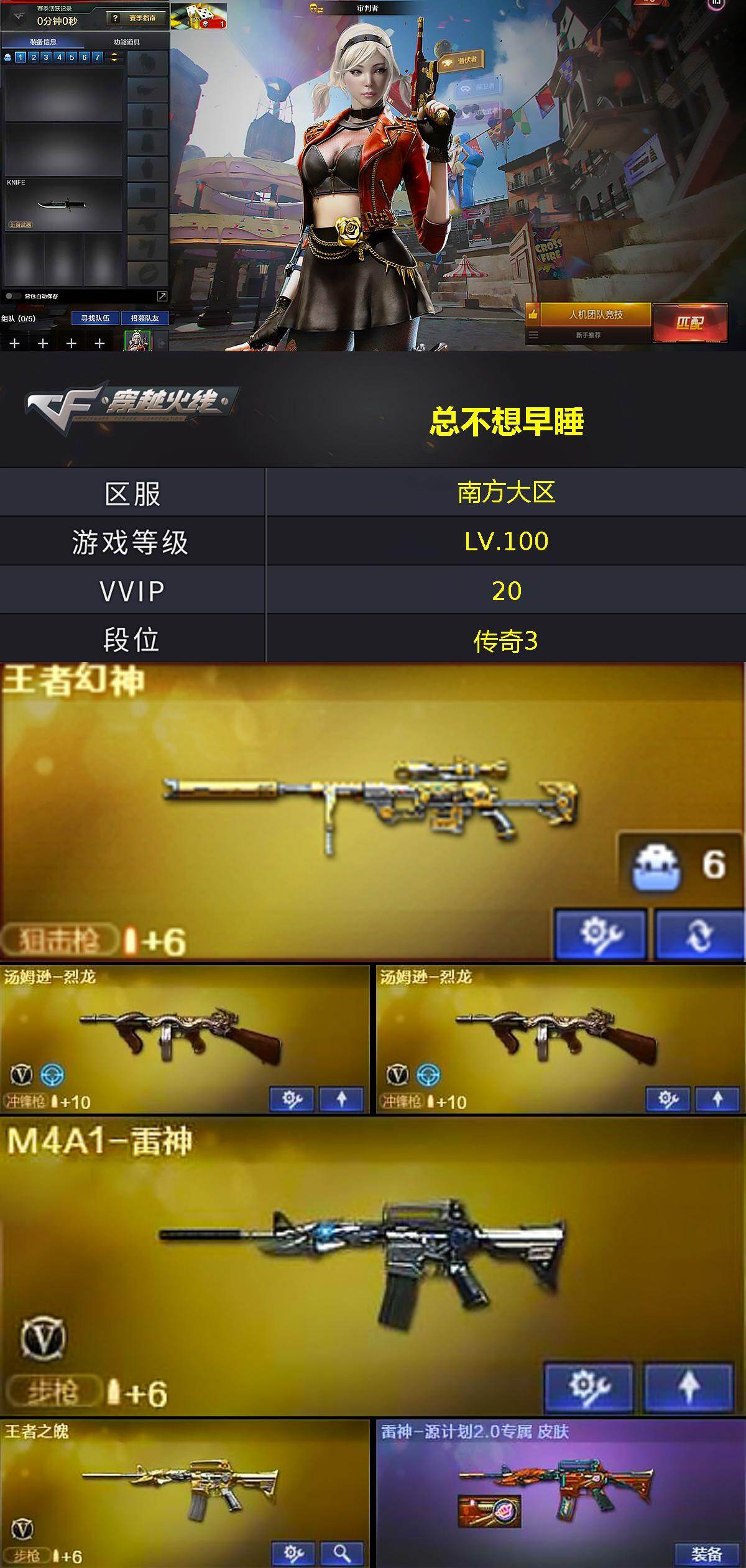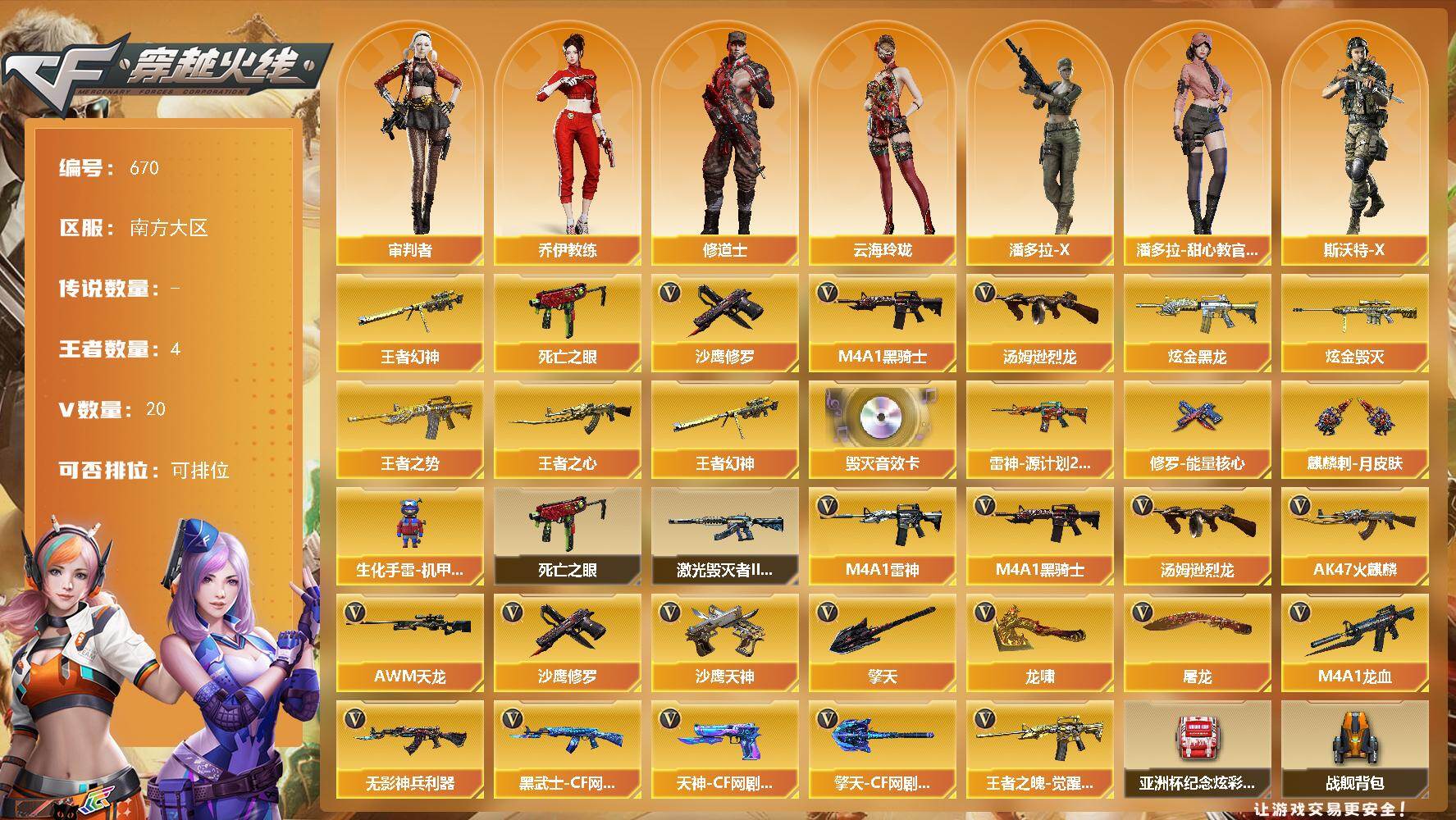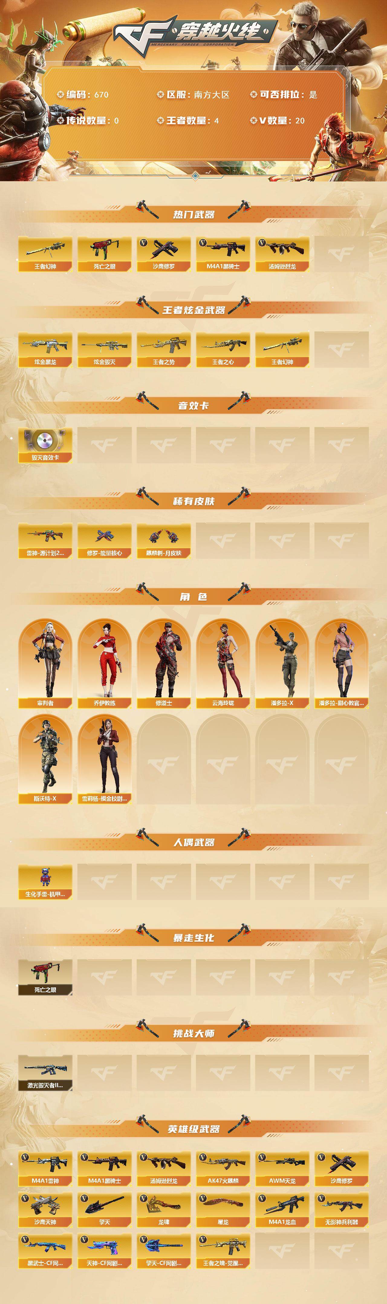 [15347761]南方大区-20V-4王者-2炫金 【热门武器】:王者幻神,死亡之眼,M4A1-黑骑士,汤姆逊-烈龙*2,沙鹰-修罗 【王者炫金武器】:王者之势,王者之心,王者幻神,炫金黑龙,炫金毁灭 【音效卡】:Barrett-毁灭音效卡 【皮肤】:雷神-源计划2.0专属 皮肤,修罗-能量核心,麒麟刺-月皮肤 【角色】:审判者,乔伊教练,修道士,云海玲珑,潘多拉-X,潘多拉-甜心教官,斯沃特-X,雪莉杨-摸金校尉 【人偶武器】:生化手雷-机甲核心 【暴走生化】:死亡之眼 【挑战大师】:激光毁灭者III-白马银枪 【英雄级武器】:AK47-火麒麟,M4A1-雷神,M4A1-黑骑士,M4A1-龙血,无影-神兵利器,王者之魄-觉醒版,黑武士-CF网剧冠军,AWM-天龙*2,汤姆逊-烈龙*2,沙鹰-修罗,沙鹰-天神,天神-CF网剧冠军,屠龙*2,龙啸*2,擎天,擎天-CF网剧冠军 【道具】:亚洲杯纪念炫彩背包,战舰背包,炫彩背包,女皇终结者-魔龙之吻,绿色巨人,灵魂忍者,迷雾幽灵,夺命之镰,防化服*2,金色流光-枪王排位*2,流光-鎏金之域,枪王排位29赛季金色流光,电玩兔兔表情*2,动感闪耀表情,防弹头盔*3,防弹衣*3,C4工具钳*3,手雷包*3 【特殊枪械】:1黑骑士,2烈龙
