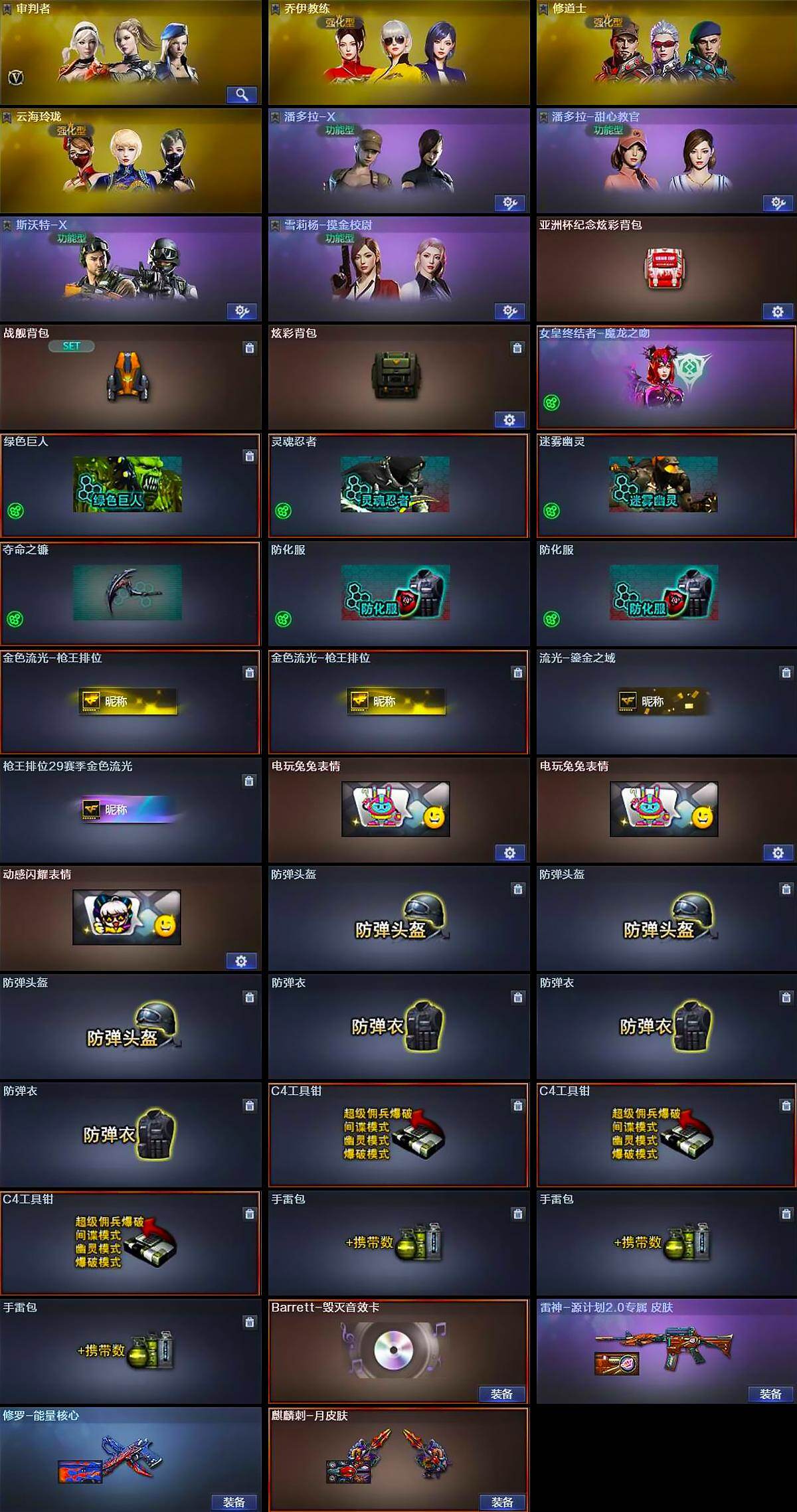 【道具】:亚洲杯纪念炫彩背包,战舰背包,炫彩背包,女皇终结者-魔龙之吻,绿色巨人,灵魂忍者,迷雾幽灵,夺命之镰,防化服*2,金色流光-枪王排位*2,流光-鎏金之域,枪王排位29赛季金色流光,电玩兔兔表情*2,动感闪耀表情,防弹头盔*3,防弹衣*3,C4工具钳*3,手雷包*3