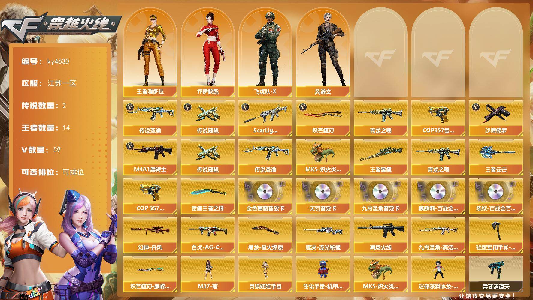[15244716]江苏一区-59V-14王者-0炫金 【传说武器】:传说圣谕,传说破晓 【传说角色】:传说影煞 【热门武器】:传说圣谕,传说破晓,Scar Light-白虎,青龙之魄,M4A1-黑骑士,MK5-炽火炎龙,COP 357-雷霆王者,沙鹰-修罗,炽芒蝶刃 【王者炫金武器】:青龙之魄,王者星霆,COP 357-雷霆王者,雷霆王者之锋*2,王者云击 【音效卡】:QBZ03-金色蔷薇音效卡,QBZ03-天罚音效卡,九霄圣角音效卡,麒麟刺-百战金芒-盛典舞曲音效卡,炼狱-百战金芒-庆典舞曲音效卡 【皮肤】:幻神-丹凤,白虎-AG-CFPLS20冠军,裁决-流光秘银,M4A1-再燃火线,九霄圣角-高洁仙镜 皮肤,屠龙-星火燎原,轻型军用手斧-再燃火线,炽芒蝶刃-巅峰荣耀 皮肤 【角色】:王者潘多拉,乔伊教练,飞虎队-X,风暴女 【人偶武器】:MK5-炽火炎龙,M37-葵,生化手雷-机甲核心,迷你深渊冰龙-王绿豆,灵狐娃娃手雷 【暴走生化】:异变清道夫,KAC-狂怒咆哮,黑龙吞噬者 【英雄级武器】:M4A1-千变,M4A1-黑龙,M4A1-黑骑士,AK47-无影,Scar Light-白虎,QBZ03-天罚,QBZ03-云龙,黑武士-锦绣游龙,九霄圣角,王者之势-觉醒版,王者玄武-觉醒版,AWM-裁决,VSK-94-金蚀,Barrett-金色蔷薇,Barrett-雷霆王者-觉醒版,炼狱-百战金芒,AA-12-雷霆,沙鹰-修罗,沙鹰-天神*2,COP 357-云龙,Anaconda-玄豹,USP-冥王,屠龙*3,擎天,麒麟刺,炽芒蝶刃,麒麟刺-百战金芒,丛林匕首-玄豹,高爆手雷-雷霆*2,高爆手雷-云龙*5,高爆手雷-玄豹,闪光弹-雷霆,闪光弹-云龙*5,闪光弹-雷霆王者-觉醒版,烟雾弹-雷霆,烟雾弹-云龙*5,烟雾弹-雷霆王者-觉醒版 【道具】:EP战队炫彩背包,女皇终结者-背包,百战金芒炫彩背包,女皇终结者-魔龙之吻,绿色巨人,灵魂忍者*2,妖姬,迷雾幽灵,夺命之镰,防化服*3,语音特效-盛典烟火,萌萌小葵表情,防弹头盔*3,防弹衣*3,C4工具钳*3,手雷包*3 【特殊枪械】:1白虎,1黑骑士