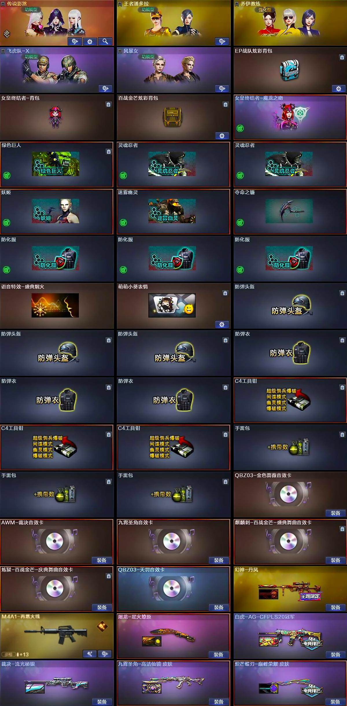 【英雄级武器】:M4A1-千变,M4A1-黑龙,M4A1-黑骑士,AK47-无影,Scar Light-白虎,QBZ03-天罚,QBZ03-云龙,黑武士-锦绣游龙,九霄圣角,王者之势-觉醒版,王者玄武-觉醒版,AWM-裁决,VSK-94-金蚀,Barrett-金色蔷薇,Barrett-雷霆王者-觉醒版,炼狱-百战金芒,AA-12-雷霆,沙鹰-修罗,沙鹰-天神*2,COP 357-云龙,Anaconda-玄豹,USP-冥王,屠龙*3,擎天,麒麟刺,炽芒蝶刃,麒麟刺-百战金芒,丛林匕首-玄豹,高爆手雷-雷霆*2,高爆手雷-云龙*5,高爆手雷-玄豹,闪光弹-雷霆,闪光弹-云龙*5,闪光弹-雷霆王者-觉醒版,烟雾弹-雷霆,烟雾弹-云龙*5,烟雾弹-雷霆王者-觉醒版