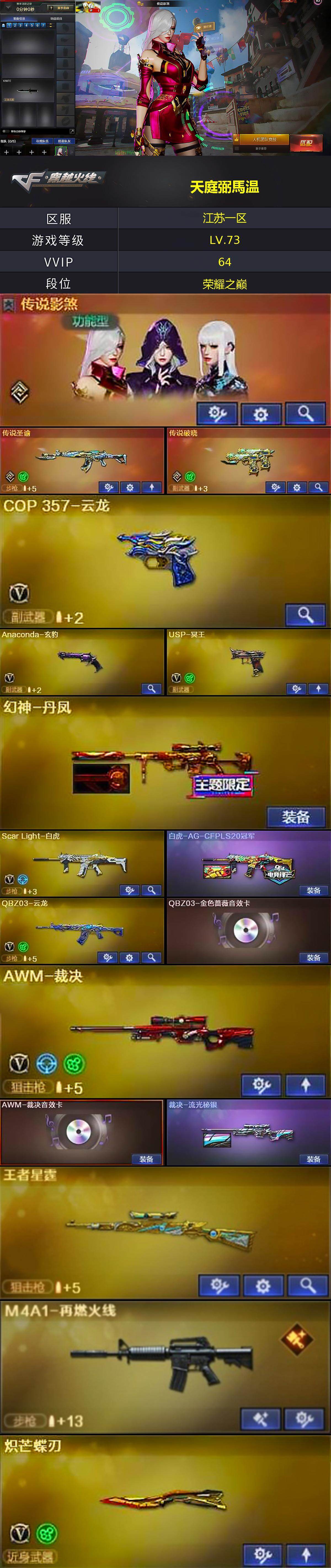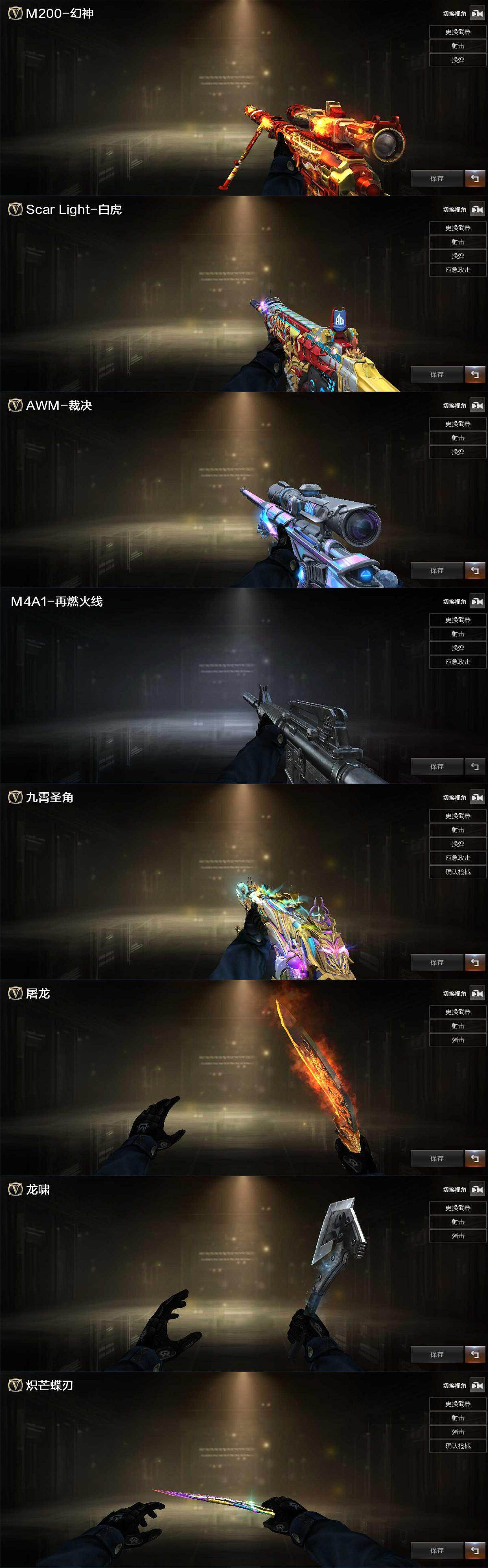 【皮肤】:幻神-丹凤,白虎-AG-CFPLS20冠军,裁决-流光秘银,M4A1-再燃火线,九霄圣角-高洁仙镜 皮肤,屠龙-星火燎原,轻型军用手斧-再燃火线,炽芒蝶刃-巅峰荣耀 皮肤