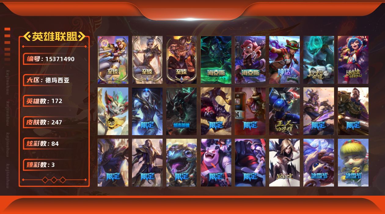 白银段位-172英雄-247皮肤-84炫彩-0终极-9神话-22限定-25传说-81史诗