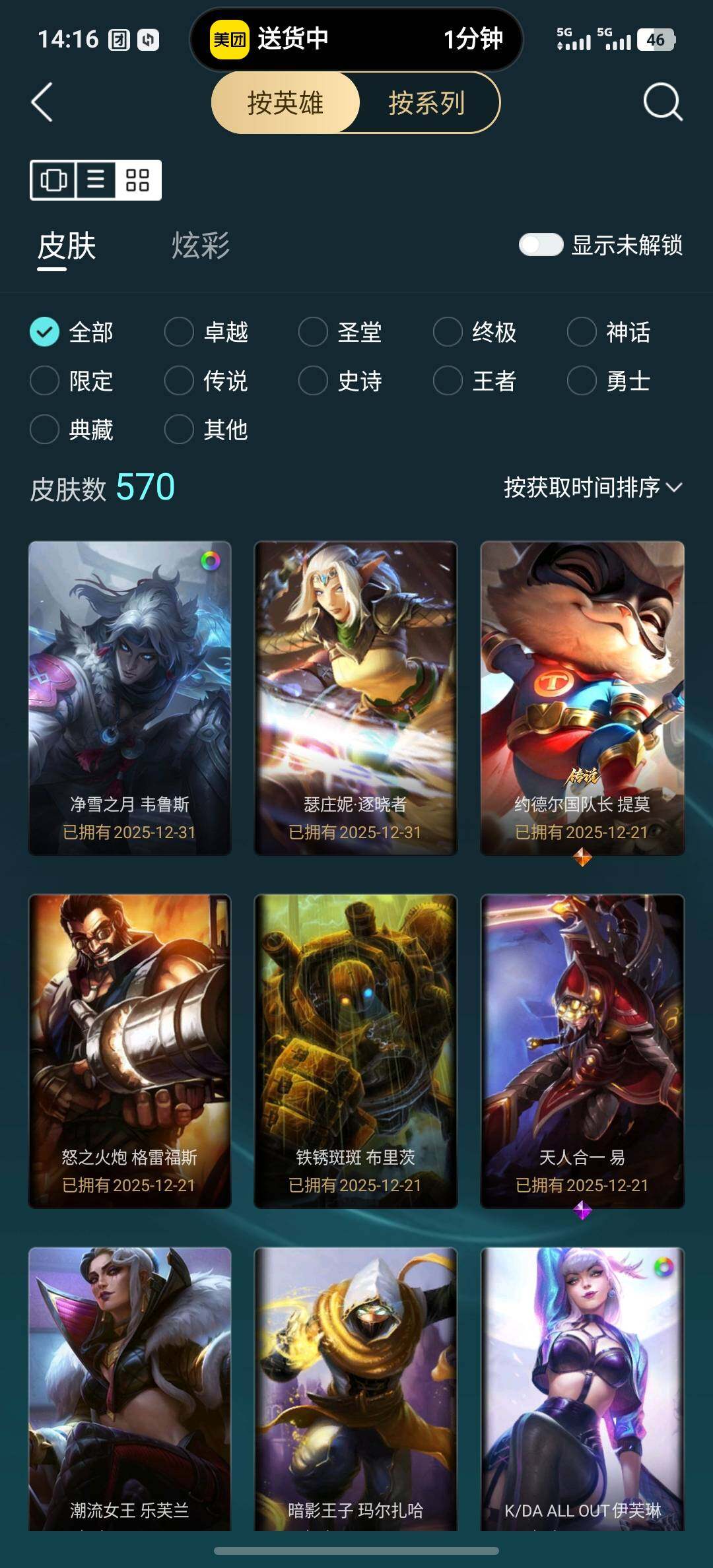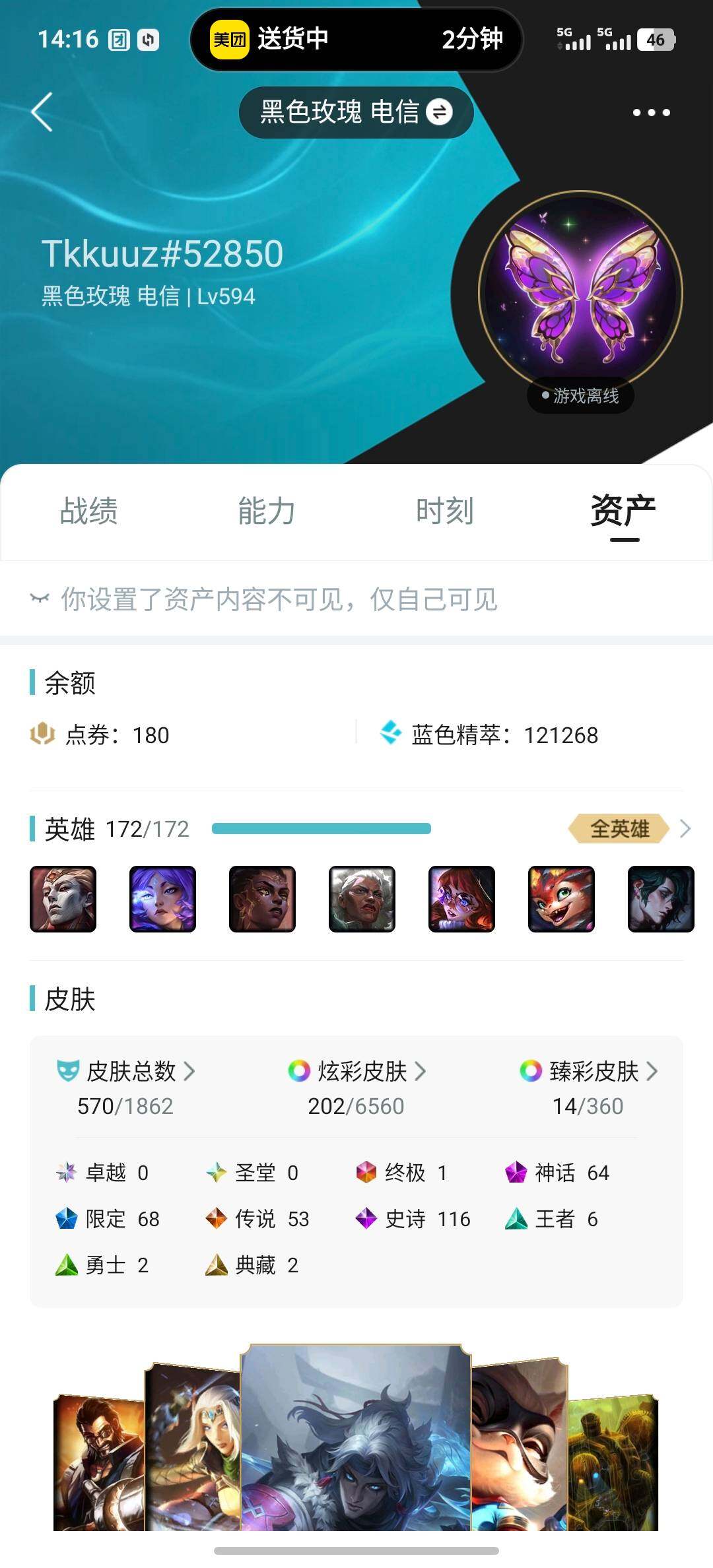 [15374258]【店主推荐捡漏号!可直接换绑】未定级段位-172英雄-570皮肤-202炫彩-1终极-64神话-68限定-53传说-116史诗
