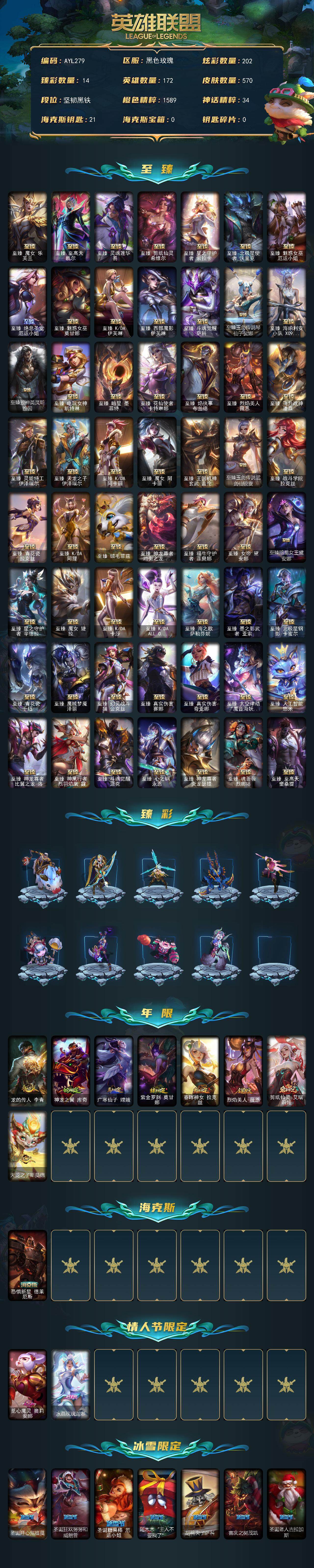 [15374258]【店主推荐捡漏号!可直接换绑】未定级段位-172英雄-570皮肤-202炫彩-1终极-64神话-68限定-53传说-116史诗 【至臻皮肤】:至臻魔女乐芙兰,至臻至高天凯尔,至臻灵魂莲华易,至臻剪纸仙灵希维尔,至臻星之守护者索拉卡,至臻北极星使者沃里克,至臻魅惑女巫厄运小姐,至臻绝息圣堂厄运小姐,至臻魅惑女巫莫甘娜,至臻KDA伊芙琳,至臻西部魔影伊芙琳,至臻斗魂觉醒萨科,至臻玉剑传说琴仙子娑娜,至臻海珀利安小队X09星环灵风迦娜,至臻狼神英灵斯维因,至臻电玩女神凯特琳,至臻暗星墨菲特,至臻花仙使者卡特琳娜,至臻焰执事布兰德,至臻烈焰美人薇恩,至臻飞升战神潘森,至臻灵能特工伊泽瑞尔,至臻天龙之子伊泽瑞尔,至臻KDA阿卡丽,至臻魔女阿卡丽,至臻王国机神玄武盖伦,至臻玉剑传说武剑仙锐雯,至臻战斗学院拉克丝,至臻青花瓷拉克丝,至臻KDA阿狸,至臻绒毛菲兹,至臻神龙尊者均衡之龙沃利贝尔,至臻福牛守护者菲奥娜,至臻女帝黛安娜,至臻暗星女王黛安娜,至臻星之守护者辛德拉,至臻魔女婕拉,至臻KDA卡莎,至臻KDAALLOUT卡莎,至臻海之歌萨勒芬妮,至臻墨之影武者亚索,至臻北极星钢影卡蜜尔,至臻青花瓷千珏,至臻魔域梦魇泽丽,至臻幻灵战斗猫金克丝,至臻真实伤害赛娜,至臻真实伤害奇亚娜,至臻太空律动魔音海妖娜美,至臻人工智能悠米,至臻神龙尊者比翼之龙洛,至臻神凰行者烈羽焰凰霞,至臻斗魂觉醒派克,至臻心之钢永恩,至臻神龙尊者炎龙瑟提,至臻魂蔷薇烈娜塔,至臻至高天奎桑提 【臻彩皮肤】:天龙之子卡莎飞龙乘云,无畏骑士瑟庄妮赤子初心,冠军之箭艾希凯旋圣装,冰霜之刃艾瑞莉娅炫金,墨之影武者亚索金墨耀影,霸天异形卡兹克掠空魅影,玉剑传说无影竞星,咖啡甜心璐璐焦糖布丁,星之守护者金克丝黑洞,可爱可爱粉红红布里茨,殿堂传奇乐芙兰登神,魔女阿卡丽虚荣,净雪之月莫甘娜冬虹,心之钢伊泽瑞尔天纵才华 【年限皮肤】:龙的传人李青,神龙之翼库奇,广寒仙子嫦娥,紫金罗刹莫甘娜,春晖神女拉克丝,烈焰美人薇恩,剪纸仙灵艾瑞莉娅,天龙之子斯莫德 【海克斯皮肤】:恐惧新星德莱厄斯 【情人节限定】:觅心魔灵奥莉安娜,水晶玫瑰迦娜 【冰雪限定】:圣诞开心鬼提莫,圣诞狂欢努努和威朗普,圣诞糖果棒厄运小姐,阿木木“主人不要我了”,胡桃夹子萨科,喜庆之树茂凯,圣诞老人古拉加斯,圣诞驯鹿克格莫,魄罗骑士瑟庄妮,雪球也能爆炸吉格斯,寒冬