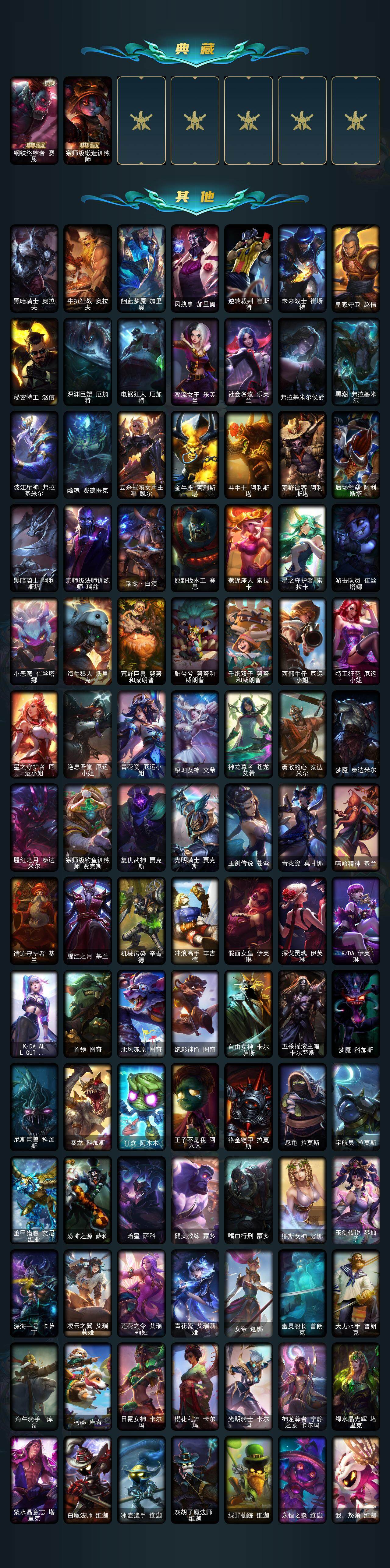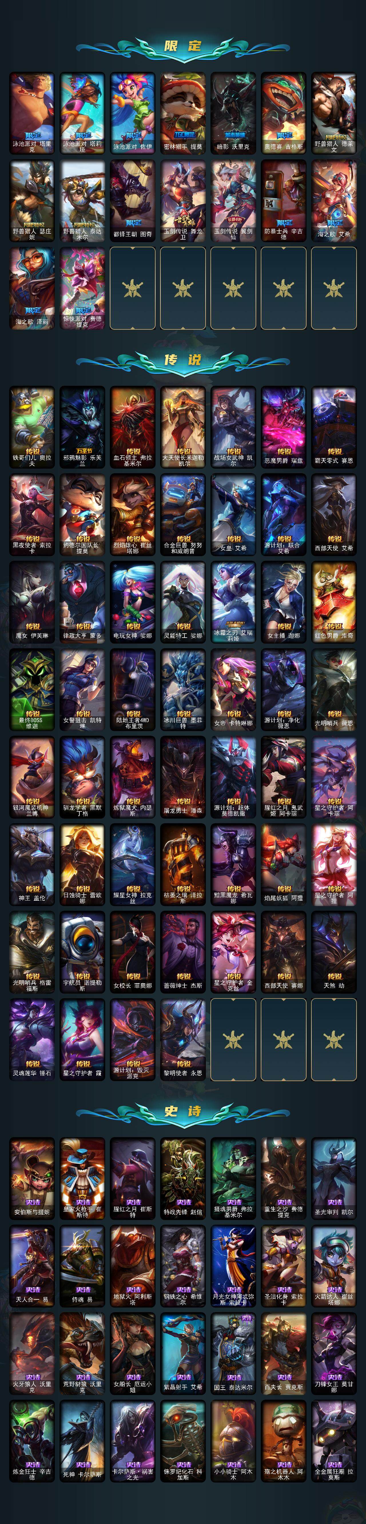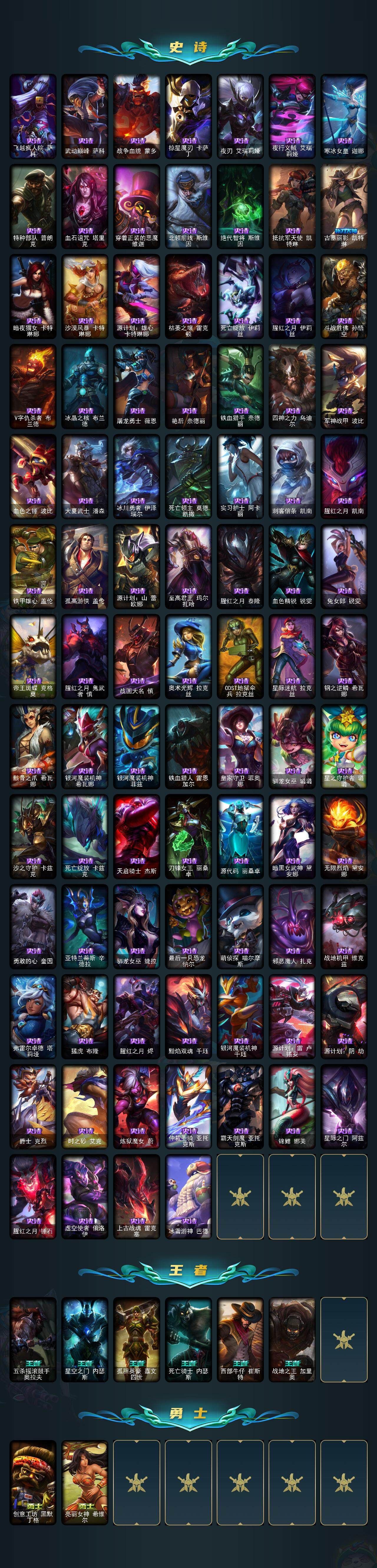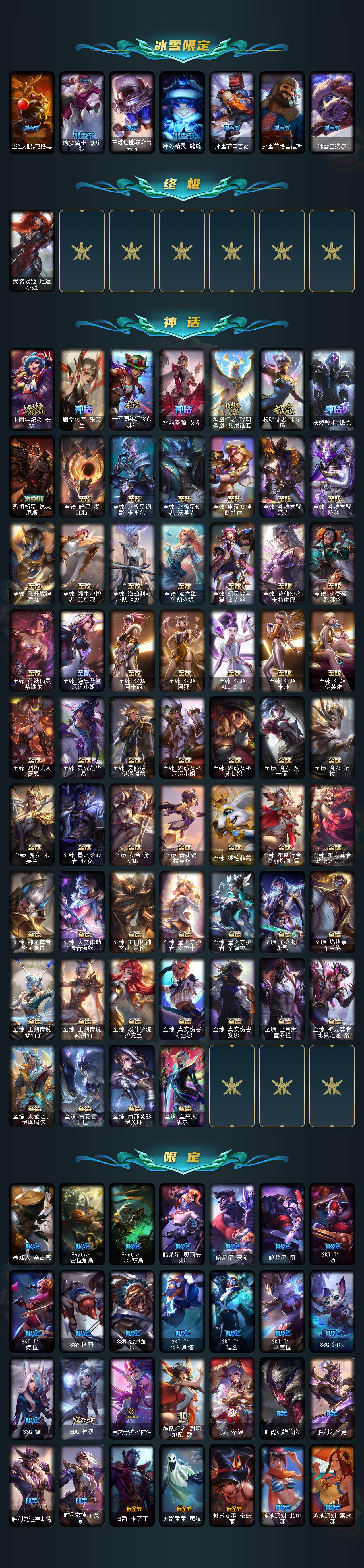 【至臻皮肤】:至臻魔女乐芙兰,至臻至高天凯尔,至臻灵魂莲华易,至臻剪纸仙灵希维尔,至臻星之守护者索拉卡,至臻北极星使者沃里克,至臻魅惑女巫厄运小姐,至臻绝息圣堂厄运小姐,至臻魅惑女巫莫甘娜,至臻KDA伊芙琳,至臻西部魔影伊芙琳,至臻斗魂觉醒萨科,至臻玉剑传说琴仙子娑娜,至臻海珀利安小队X09星环灵风迦娜,至臻狼神英灵斯维因,至臻电玩女神凯特琳,至臻暗星墨菲特,至臻花仙使者卡特琳娜,至臻焰执事布兰德,至臻烈焰美人薇恩,至臻飞升战神潘森,至臻灵能特工伊泽瑞尔,至臻天龙之子伊泽瑞尔,至臻KDA阿卡丽,至臻魔女阿卡丽,至臻王国机神玄武盖伦,至臻玉剑传说武剑仙锐雯,至臻战斗学院拉克丝,至臻青花瓷拉克丝,至臻KDA阿狸,至臻绒毛菲兹,至臻神龙尊者均衡之龙沃利贝尔,至臻福牛守护者菲奥娜,至臻女帝黛安娜,至臻暗星女王黛安娜,至臻星之守护者辛德拉,至臻魔女婕拉,至臻KDA卡莎,至臻KDAALLOUT卡莎,至臻海之歌萨勒芬妮,至臻墨之影武者亚索,至臻北极星钢影卡蜜尔,至臻青花瓷千珏,至臻魔域梦魇泽丽,至臻幻灵战斗猫金克丝,至臻真实伤害赛娜,至臻真实伤害奇亚娜,至臻太空律动魔音海妖娜美,至臻人工智能悠米,至臻神龙尊者比翼之龙洛,至臻神凰行者烈羽焰凰霞,至臻斗魂觉醒派克,至臻心之钢永恩,至臻神龙尊者炎龙瑟提,至臻魂蔷薇烈娜塔,至臻至高天奎桑提