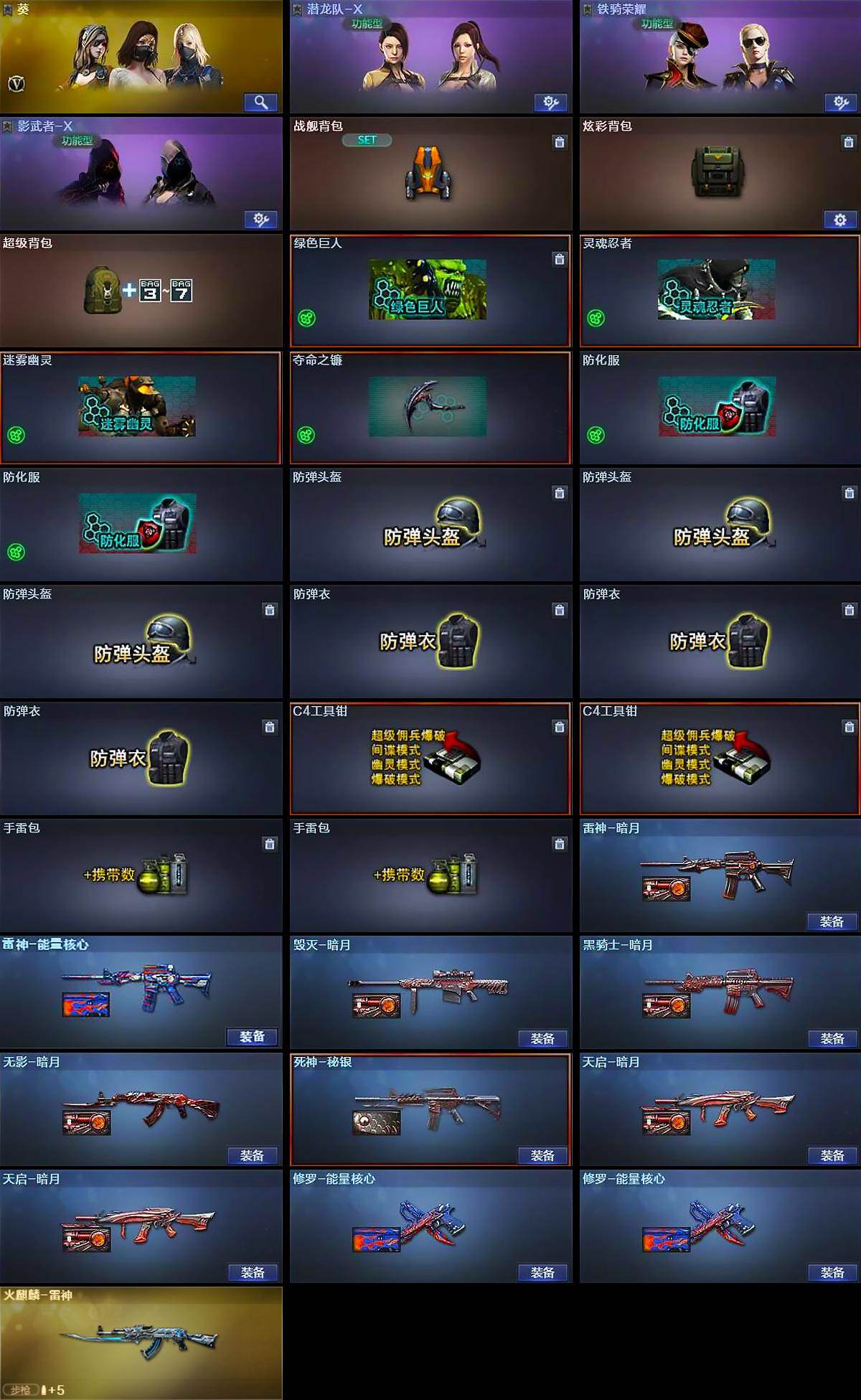 【道具】:战舰背包,炫彩背包,超级背包,绿色巨人,灵魂忍者,迷雾幽灵,夺命之镰,防化服*2,防弹头盔*3,防弹衣*3,C4工具钳*2,手雷包*2