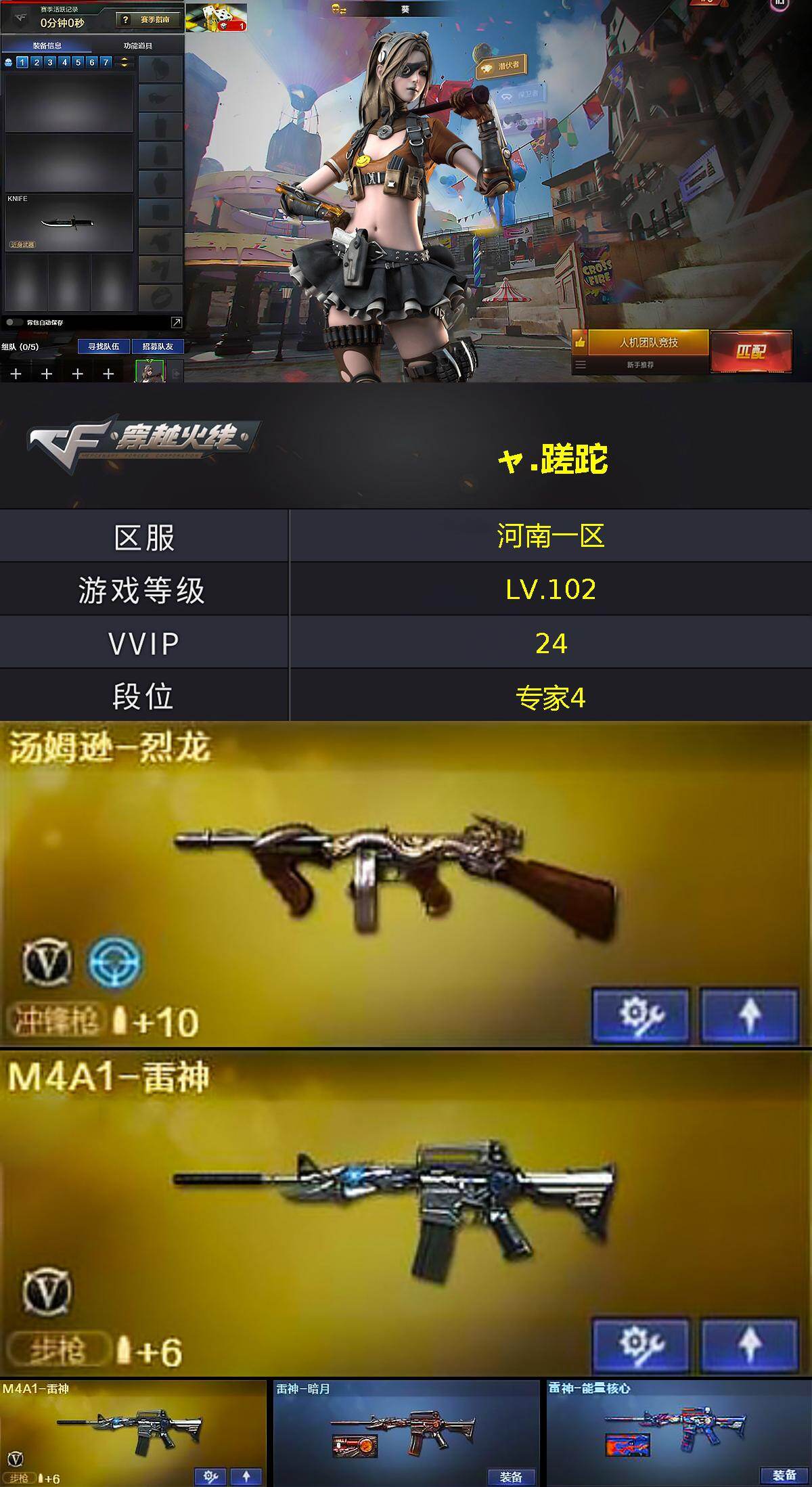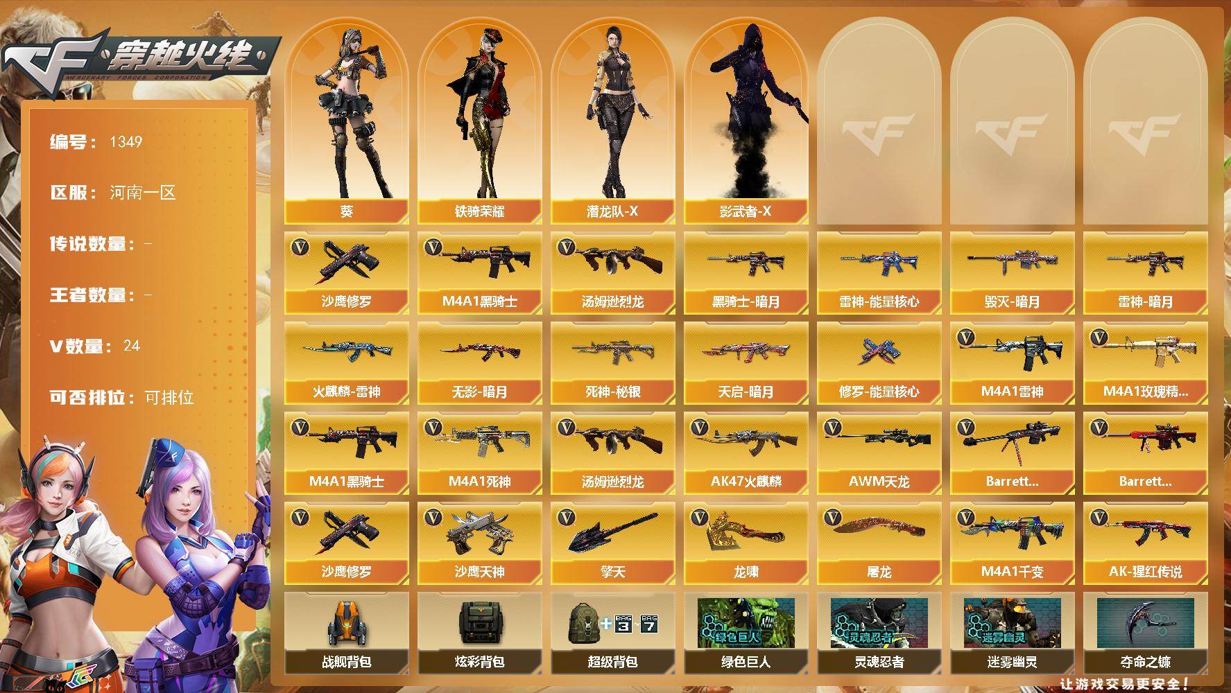 [15376474]河南一区-24V-0王者-0炫金 【热门武器】:M4A1-黑骑士,汤姆逊-烈龙,沙鹰-修罗*3 【皮肤】:雷神-暗月,雷神-能量核心,火麒麟-雷神,毁灭-暗月,黑骑士-暗月,无影-暗月,死神-秘银,天启-暗月*2,修罗-能量核心*2 【角色】:葵,潜龙队-X,铁骑荣耀,影武者-X 【英雄级武器】:M4A1-千变,AK47-火麒麟,M4A1-雷神*2,M4A1-黑骑士,M4A1-死神,M4A1-玫瑰精灵,AK-47-猩红传说*2,AWM-天龙,Barrett-毁灭*2,Barrett-极光,汤姆逊-烈龙,沙鹰-修罗*3,沙鹰-天神,屠龙*2,龙啸,擎天*2 【道具】:战舰背包,炫彩背包,超级背包,绿色巨人,灵魂忍者,迷雾幽灵,夺命之镰,防化服*2,防弹头盔*3,防弹衣*3,C4工具钳*2,手雷包*2 【特殊枪械】:1黑骑士,1烈龙