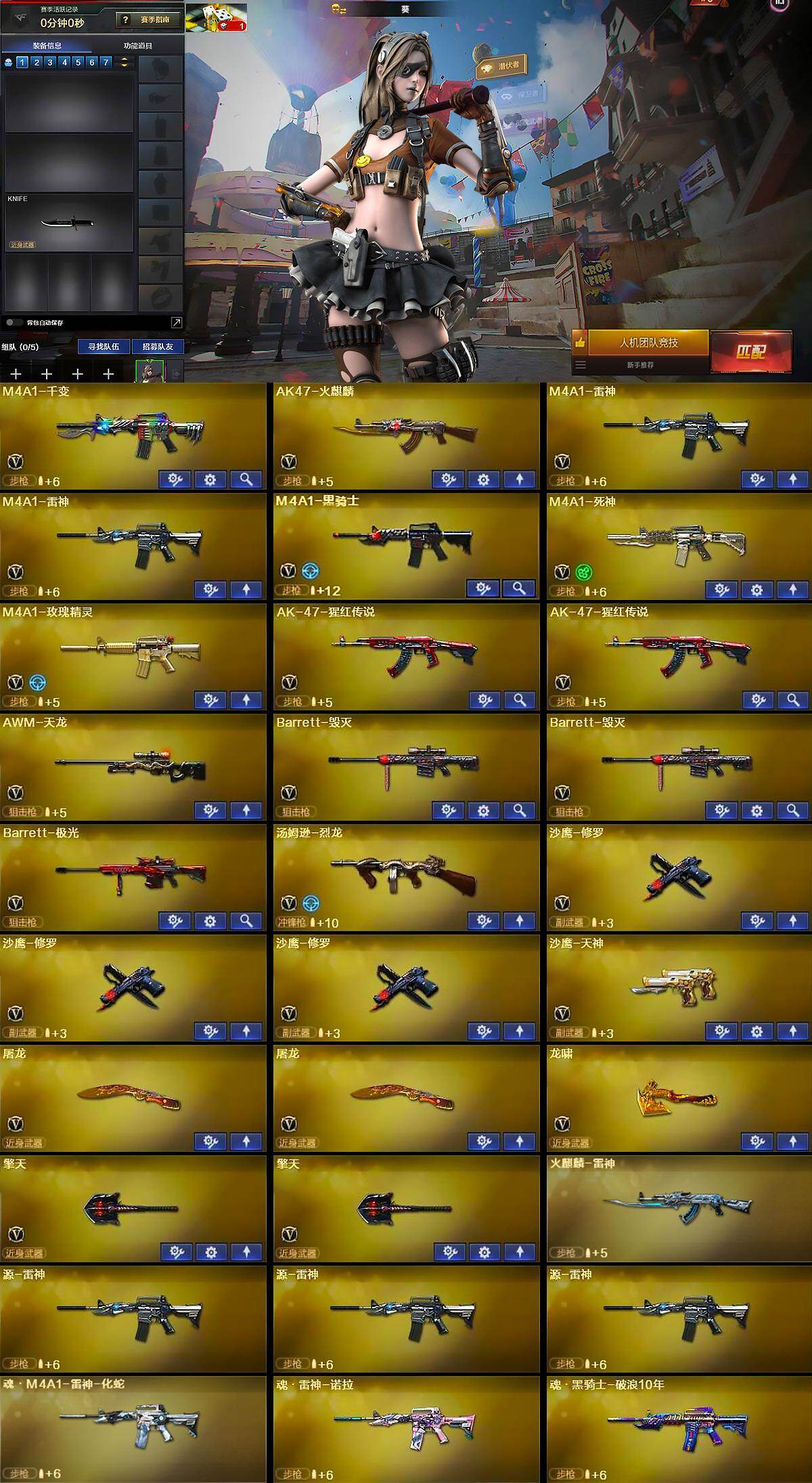 【英雄级武器】:M4A1-千变,AK47-火麒麟,M4A1-雷神*2,M4A1-黑骑士,M4A1-死神,M4A1-玫瑰精灵,AK-47-猩红传说*2,AWM-天龙,Barrett-毁灭*2,Barrett-极光,汤姆逊-烈龙,沙鹰-修罗*3,沙鹰-天神,屠龙*2,龙啸,擎天*2