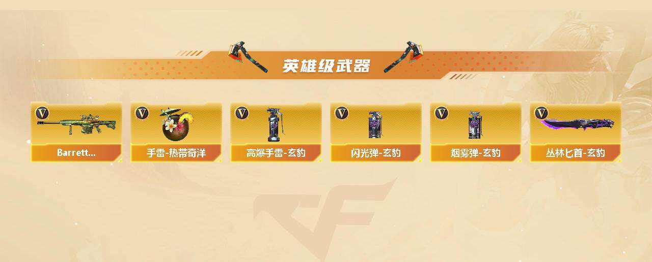 【英雄级武器】:M4A1-黑龙,M4A1-雷神,M4A1-黑骑士*2,QBZ03-天罚,黑武士-锦绣游龙,超新星-热带奇洋,FAMAS G2-天戎,SCAR Light-玄豹,M4A1-猎神,Barrett-毁灭,AWM-裁决,VSK-94-金蚀,炼狱-百战金芒,沙鹰-修罗*2,沙鹰-天神,Anaconda-玄豹,USP-冥王*2,屠龙,擎天,龙啸-热带奇洋,麒麟刺-百战金芒,丛林匕首-玄豹*3,王者冰锋-觉醒版,手雷-热带奇洋,高爆手雷-玄豹*8,闪光弹-玄豹*7,烟雾弹-玄豹*7,M4A1-赤狱骑士,M4A1-苍鸣雷神,AWM-昌龙,Barrett-碧霄极光