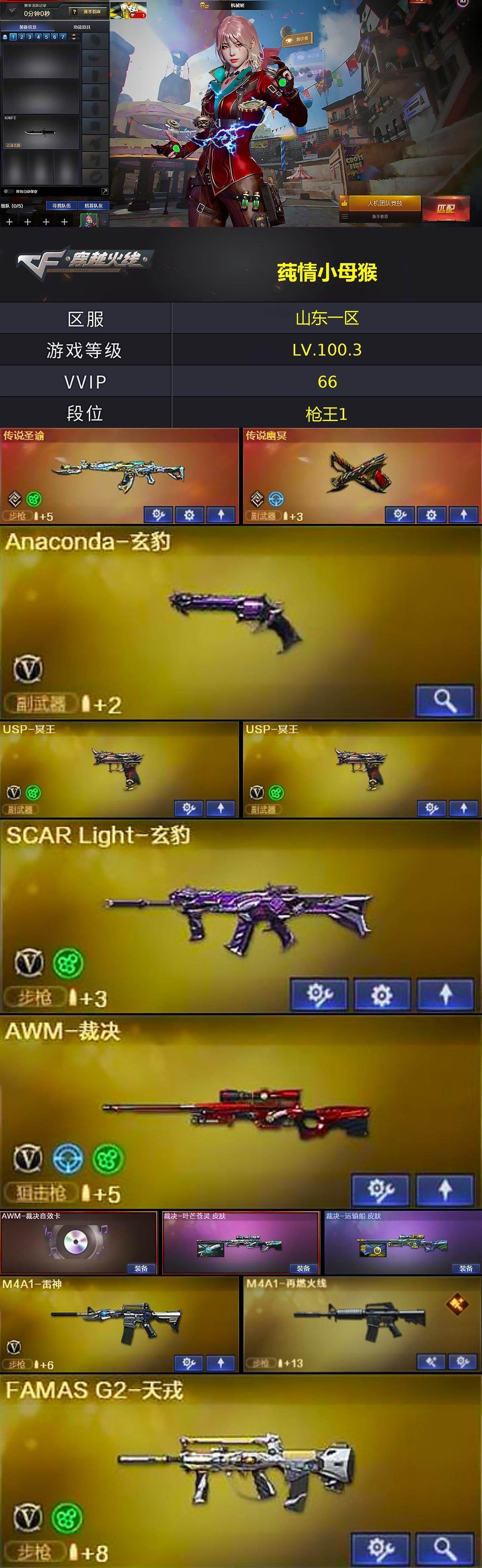 [15377098]山东一区-59V-2王者-0炫金 【传说武器】:传说圣谕,传说幽冥 【热门武器】:传说圣谕,传说幽冥,C.A.T,M4A1-黑骑士*2,沙鹰-修罗*2 【王者炫金武器】:王者玉锋 【音效卡】:M4A1-黑骑士音效卡,AWM-裁决音效卡,QBZ03-天罚音效卡,Barrett-碧霄极光音效卡,炼狱-百战金芒-庆典舞曲音效卡,AWM-昌龙-怀旧音效卡 【皮肤】:裁决-叶芒苍灵 皮肤,裁决-运输船 皮肤,M4A1-再燃火线,毁灭-黑曼巴 皮肤,M4A1-千变-孔明皮肤,黑骑士-冠军之势,AWM-再燃火线,修罗-能量核心,修罗-冠军之魂*2,轻型军用手斧-再燃火线,擎天-冠军之击 【角色】:机械姬,战地猎狐,雪域霜狐,奇洋探员,乔伊教练,修道士,暗夜-X,初恋灵狐,芳心审判者,飞虎队-X,兰妹妹,零-水下丽影,龙儿,麻雀,萌儿,潘多拉-甜心教官,蛇姬,兔囡囡,五号兵器-赛博朋克,新娜塔莎,雪莉杨-摸金校尉,游珑儿,智影 【人偶武器】:迷你律动酷熊,Scar Light-马枪,AWM-灵狐-15周年嘉年华*2,C.A.T,迷你裂空之翼,迷你波特博士,迷你曼提柯尔*2,夺魂,迷你火种,生化手雷-机甲核心*2,深渊终结者手雷 【挑战大师】:激光毁灭者III-白马银枪,试炼破坏者III 【英雄级武器】:M4A1-黑龙,M4A1-雷神,M4A1-黑骑士*2,QBZ03-天罚,黑武士-锦绣游龙,超新星-热带奇洋,FAMAS G2-天戎,SCAR Light-玄豹,M4A1-猎神,Barrett-毁灭,AWM-裁决,VSK-94-金蚀,炼狱-百战金芒,沙鹰-修罗*2,沙鹰-天神,Anaconda-玄豹,USP-冥王*2,屠龙,擎天,龙啸-热带奇洋,麒麟刺-百战金芒,丛林匕首-玄豹*3,王者冰锋-觉醒版,手雷-热带奇洋,高爆手雷-玄豹*8,闪光弹-玄豹*7,烟雾弹-玄豹*7,M4A1-赤狱骑士,M4A1-苍鸣雷神,AWM-昌龙,Barrett-碧霄极光 【道具】:BS战队炫彩背包,CFS限定背包,云山科技背包,亚洲杯纪念炫彩背包,全能枪王背包,冰冰企鹅背包,奇洋探员-海龟背包,次元之矛-背包,炫彩背包-诺拉,炫彩背包,热带奇洋炫彩背包,百战金芒炫彩背包,背包-洛丽塔,臻选金狐背包,超级背包,雪域霜狐炫彩背包,黑桃战神背包,女皇终结者-魔龙之吻,救世主-黑桃战神,黄金生化钩,绿色巨人,灵魂