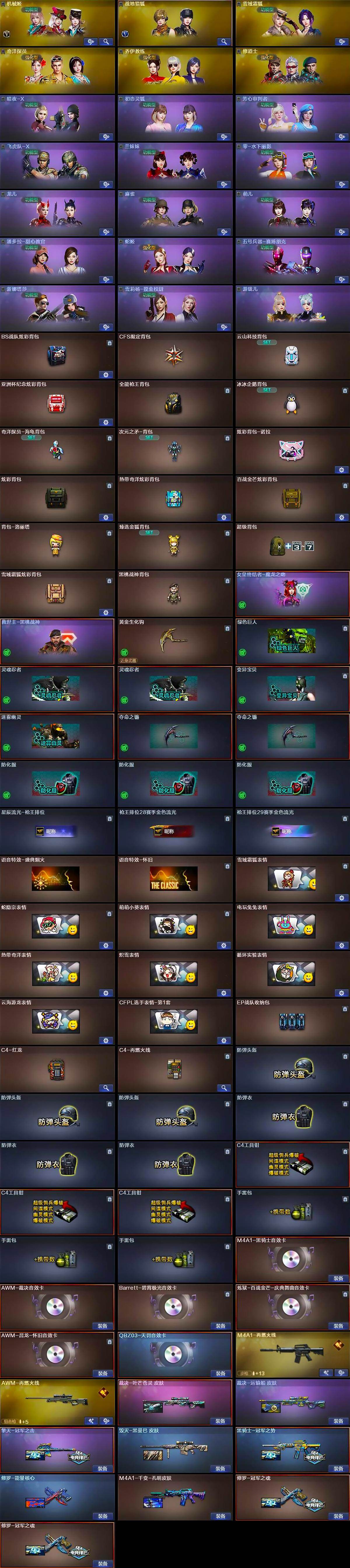 【道具】:BS战队炫彩背包,CFS限定背包,云山科技背包,亚洲杯纪念炫彩背包,全能枪王背包,冰冰企鹅背包,奇洋探员-海龟背包,次元之矛-背包,炫彩背包-诺拉,炫彩背包,热带奇洋炫彩背包,百战金芒炫彩背包,背包-洛丽塔,臻选金狐背包,超级背包,雪域霜狐炫彩背包,黑桃战神背包,女皇终结者-魔龙之吻,救世主-黑桃战神,黄金生化钩,绿色巨人,灵魂