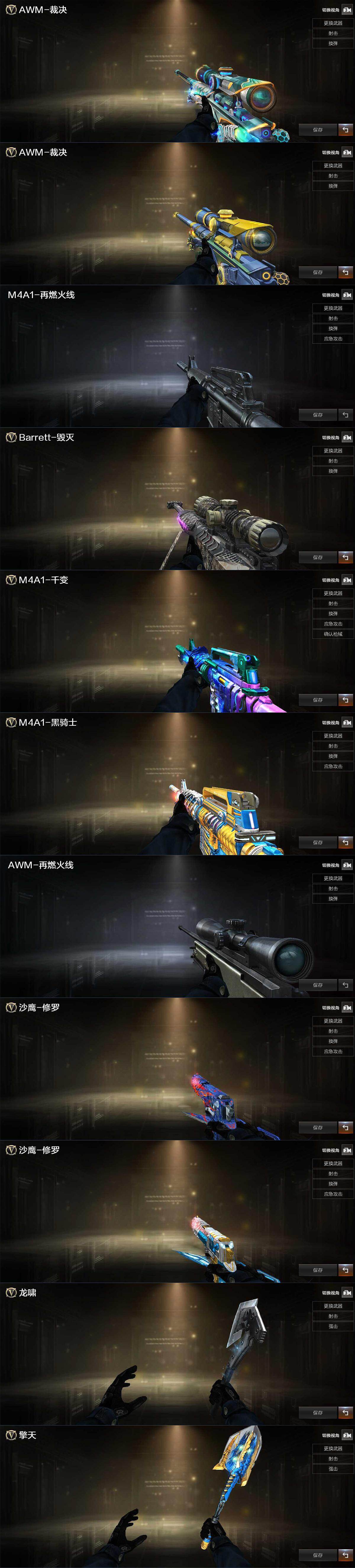 【音效卡】:M4A1-黑骑士音效卡,AWM-裁决音效卡,QBZ03-天罚音效卡,Barrett-碧霄极光音效卡,炼狱-百战金芒-庆典舞曲音效卡,AWM-昌龙-怀旧音效卡